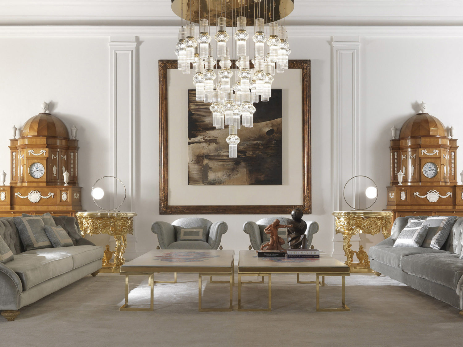 中央桌子,结构有光泽黄铜,刻有框架。顶部采用木材,带有古董白色饰面和手工装饰。