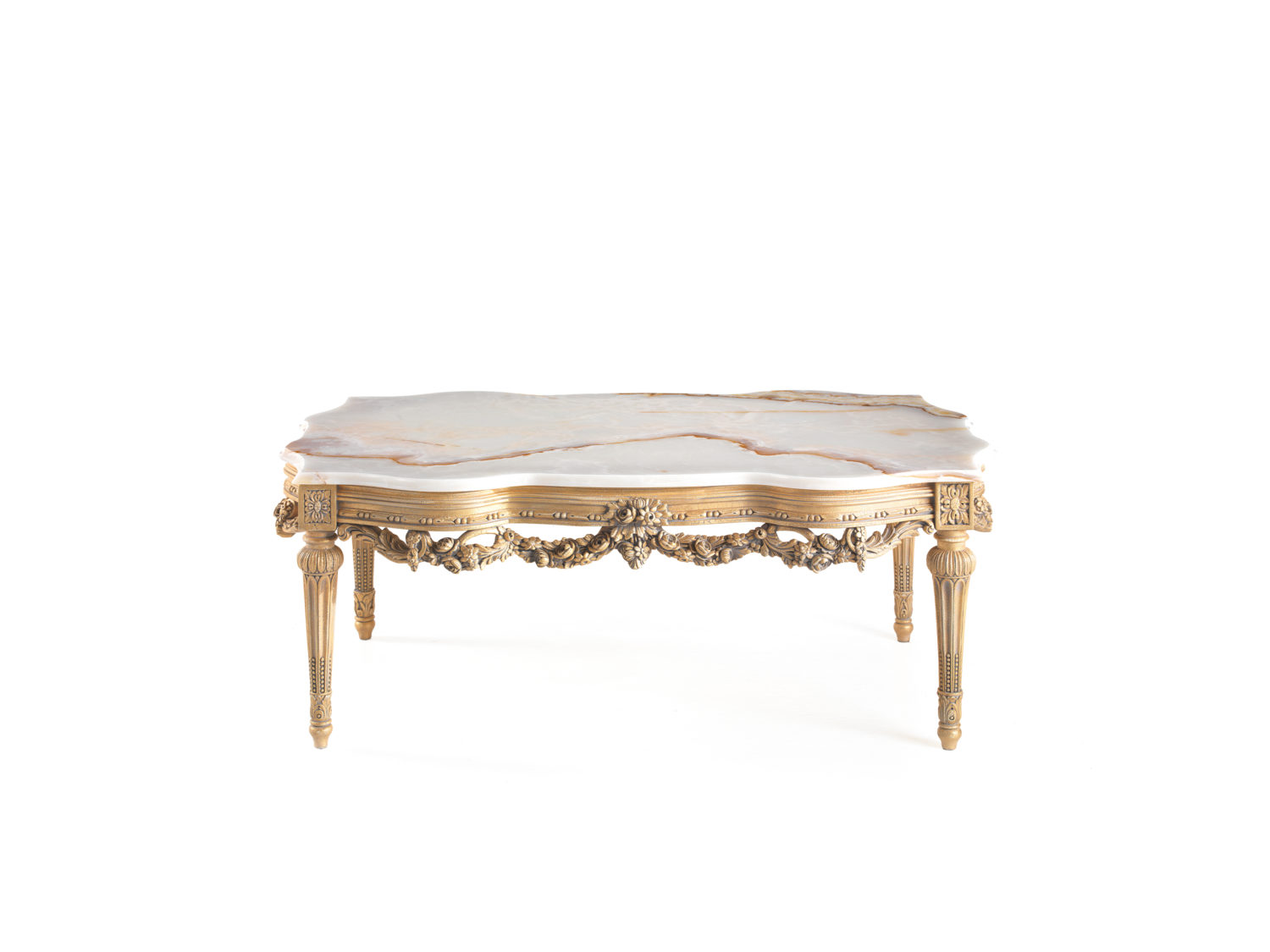 中央桌子采用手工雕刻的山毛榉木结构,带有法国黄金和象牙饰面或金色饰面。顶部在绿色的巴基斯坦玛瑙。