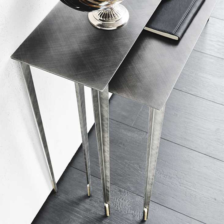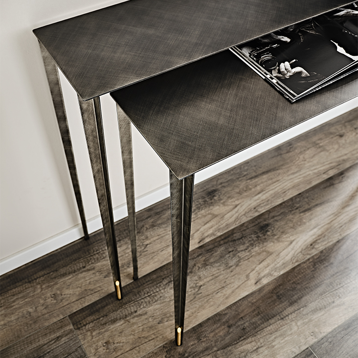 这对 Etoile设计的控制台桌因其优雅和轻盈而脱颖而出。细长的腿和两个高度的顶部之间的交叉点创造了一种编舞效果,增强了精致的饰面和黄铜细节。房子里的任何房间都被这些现代控制台重叠产生的光影对比所点缀。