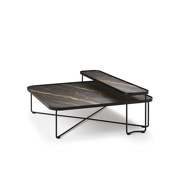 咖啡桌的框架为压纹钛 (GFM11) 或黑色 (GFM73) 漆钢框架,或底部为青铜和拉丝青铜顶框架。Marmi Alabastro (KM02)、Supreme (KM03)、Ardesia (KM04)、哑光 Golden Calacatta (KM05)、亮面 Golden Calacatta (KM06)、哑光 Portoro (KM07)、亮面 Portoro (KM08)、亮面 Sahara Noir (KM09)、Emper (KM10)、马卡鲁 (KM11)、角砾岩 (KM12)、阿雷纳尔 (KM13) 或 Zefiro (KZ20) 陶瓷台面。