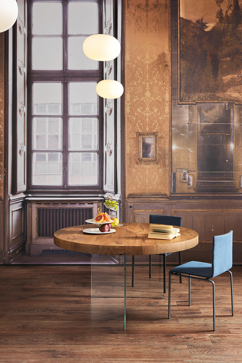 桌面有两种版本:光面玻璃或野木橡木。Air 是一张圆桌,由于其基本形状,它与具有现代设计或更经典触感的椅子完美结合。