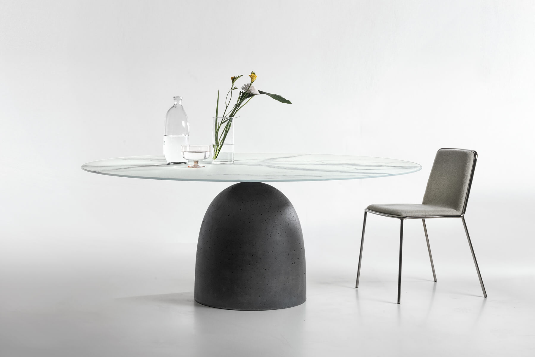 岩石巨石的线条启发了 Janeiro 桌子的项目。构成基地的混凝土块的特征形状理想地让人想起巴西著名的海角,里约热内卢的“糖面包”。桌子的底座实际上是两个圆顶形的固体,相互平衡,而桌面在底座的顶部似乎神奇地平衡。混凝土的直接和材料方法与圆形、桶形或矩形形状的底座和顶部的柔和线条完美融合。