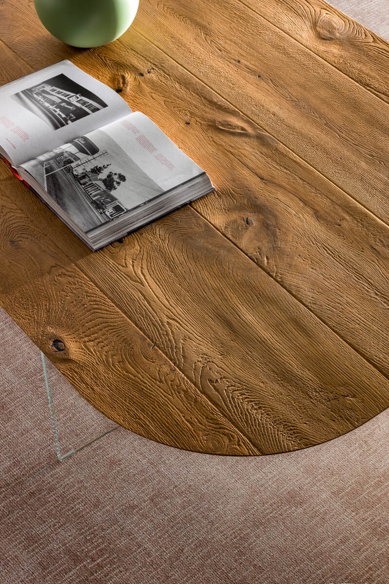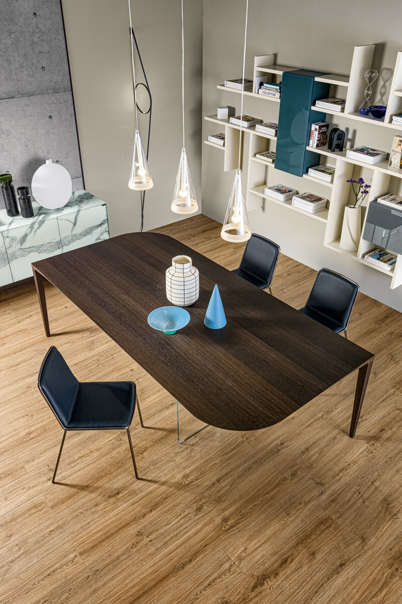 仅在两个支撑件上形成的单一材料流:这是 P&J 工作台的主要特征。薄顶部的特点是圆润的边缘,和谐地连接到顶部相对两端的木腿,从而创造出和谐流畅的连续线条。结构的橱柜制作以及位于顶部中央下方的两个不易察觉的玻璃腿的存在,保证了坚固性和抵抗力,增加了抗冲击和抗冲击性。