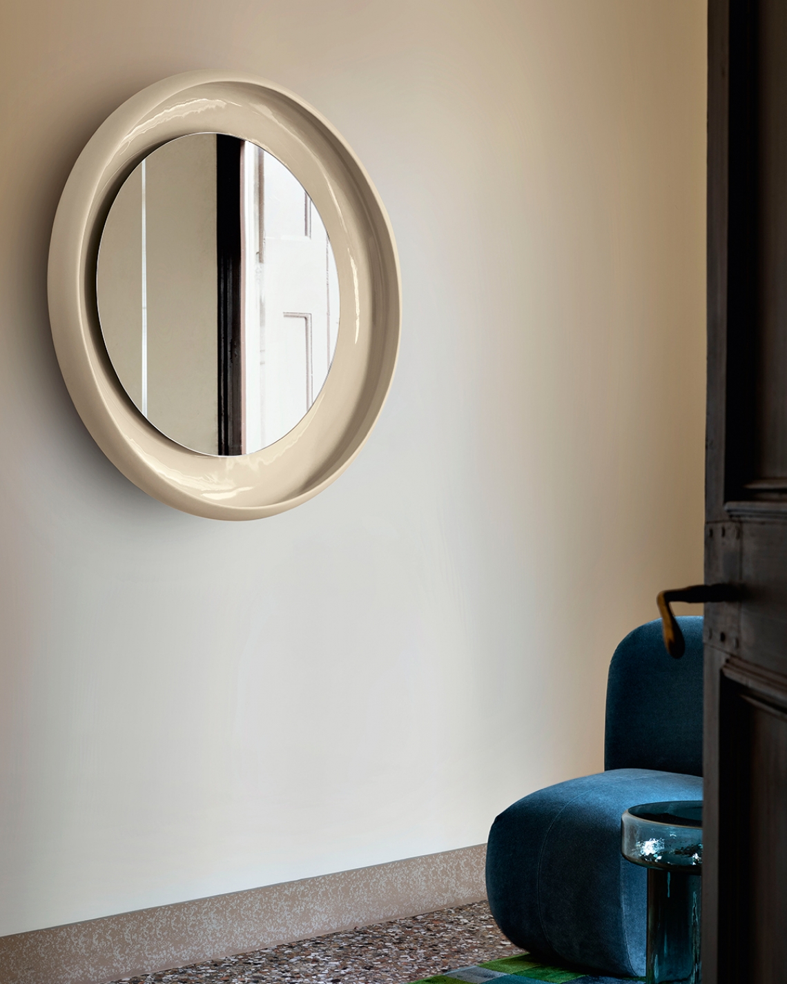 科克有动态的味道和丰富的对比。镜子由陶瓷外壳保护,两个相反的表面共存:光泽和哑光。内部表面是釉面和闪亮的,而外皮是材料。镜子被转换成一个珍贵的物体,增强自然材料,反射回荡,给客厅的意义。