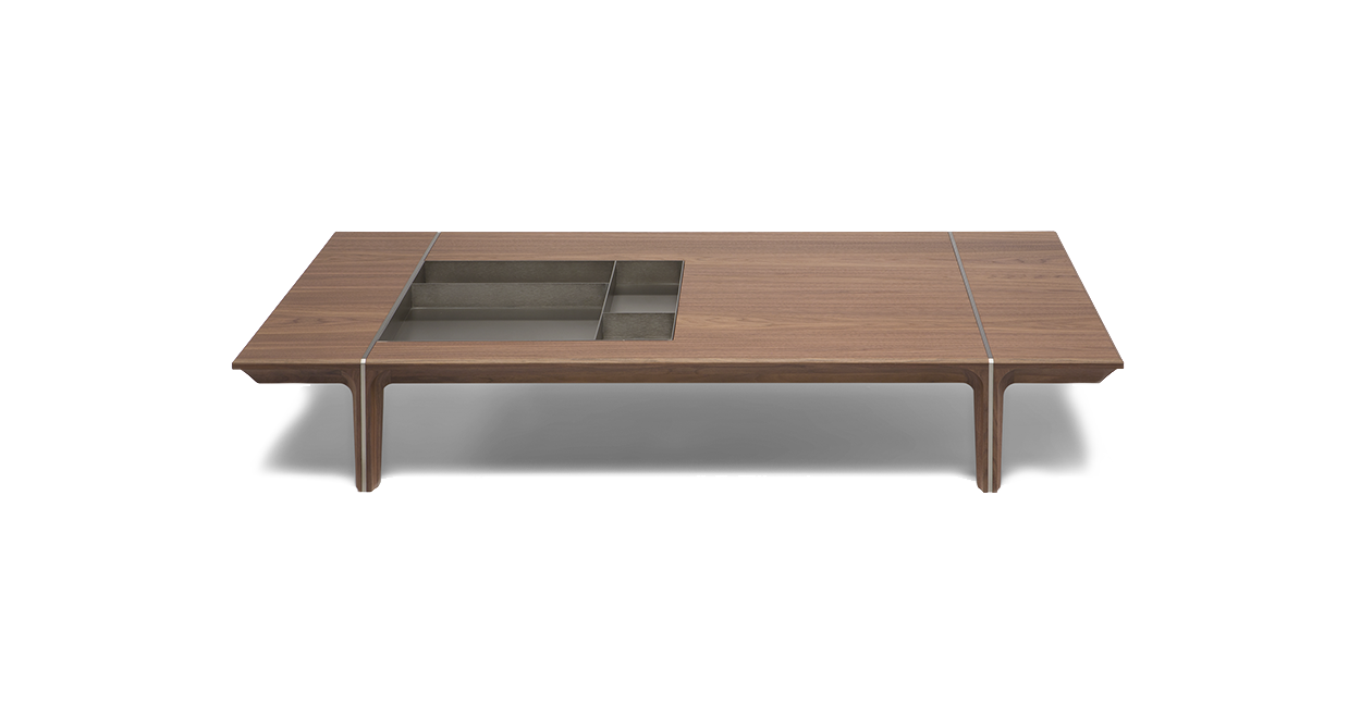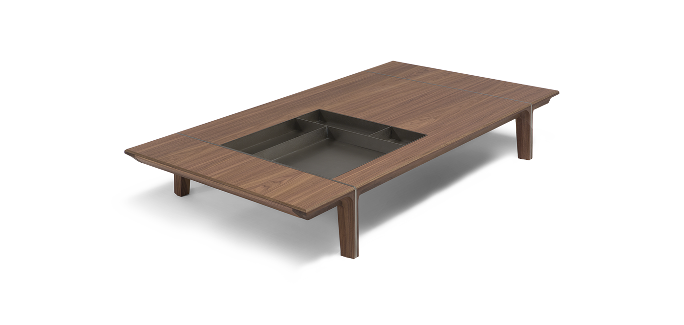 不可拆卸的储物单元采用以皮革为底座的金属材质,搭配桌子的木结构,尽显优美典雅。这种引人注目的对比出现在整个系列的产品中。置物台形式的Kendo咖啡桌为木质结构、金属底座,适于放置书籍、玻璃杯等日常物件,方便实用。