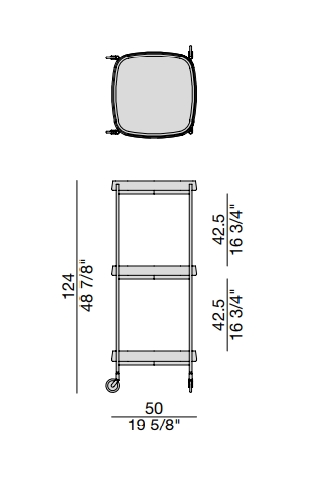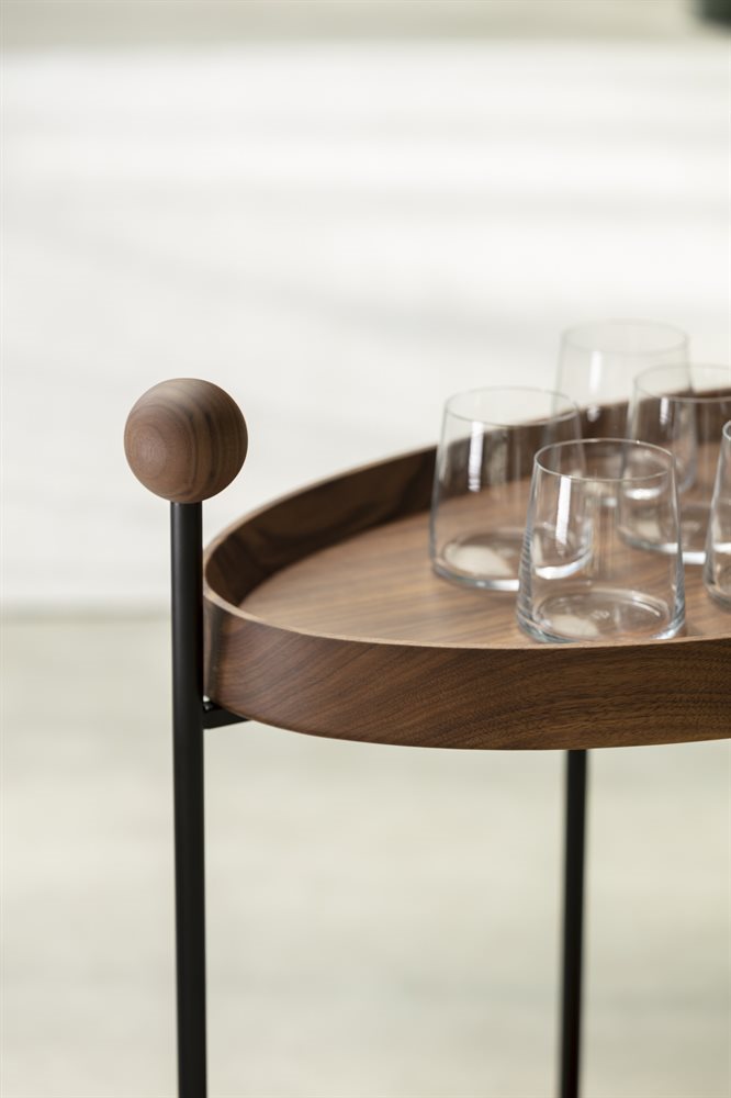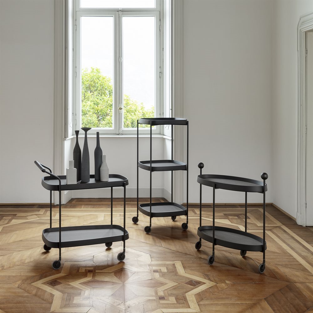 服务手推车与哑光黑色金属底座和木制上衣与固体卡纳莱塔核桃框架。顶部的内部可以在运河核桃,辉煌的漆或微直镶嵌处理。