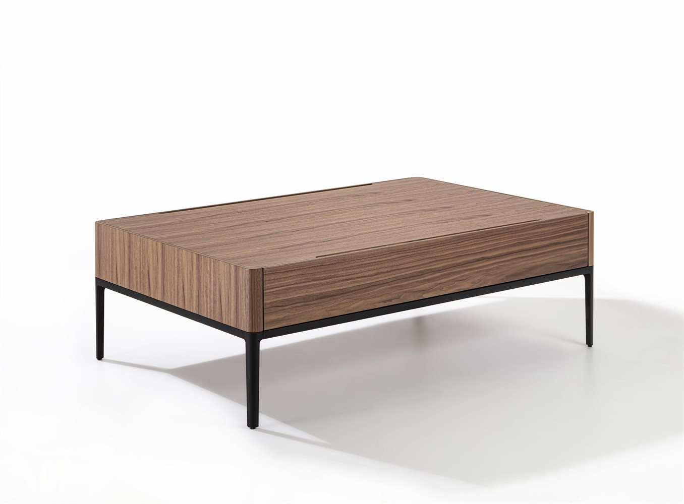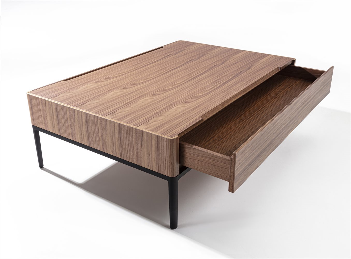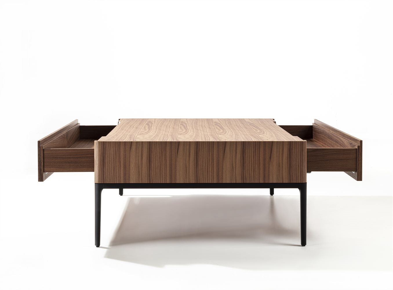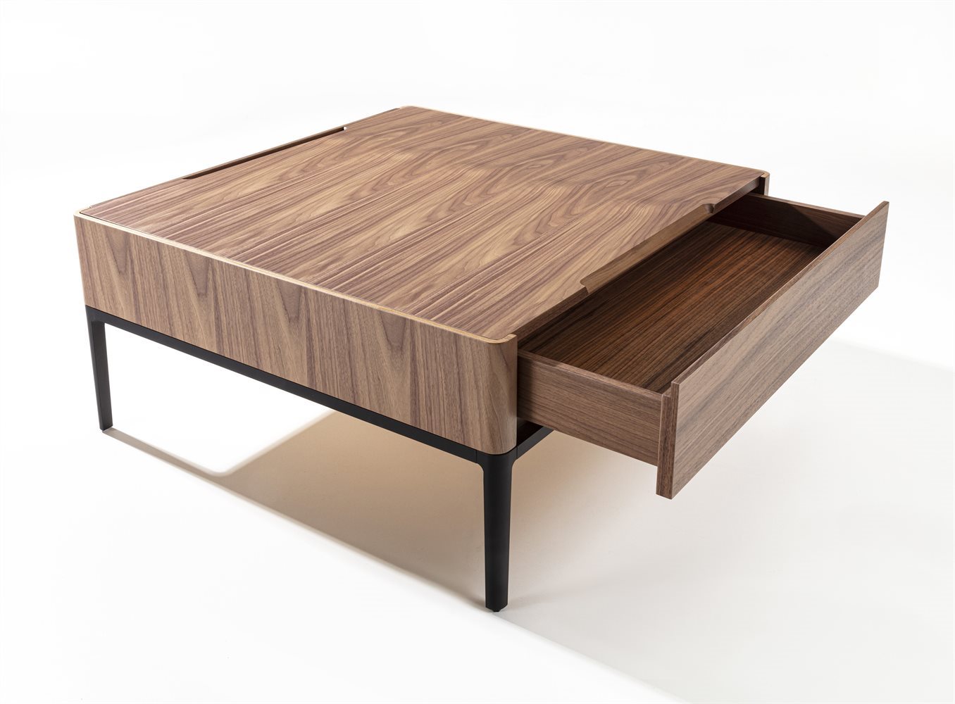 一系列咖啡桌,抽屉在运河核桃。结构为哑光黑色彩绘铝。