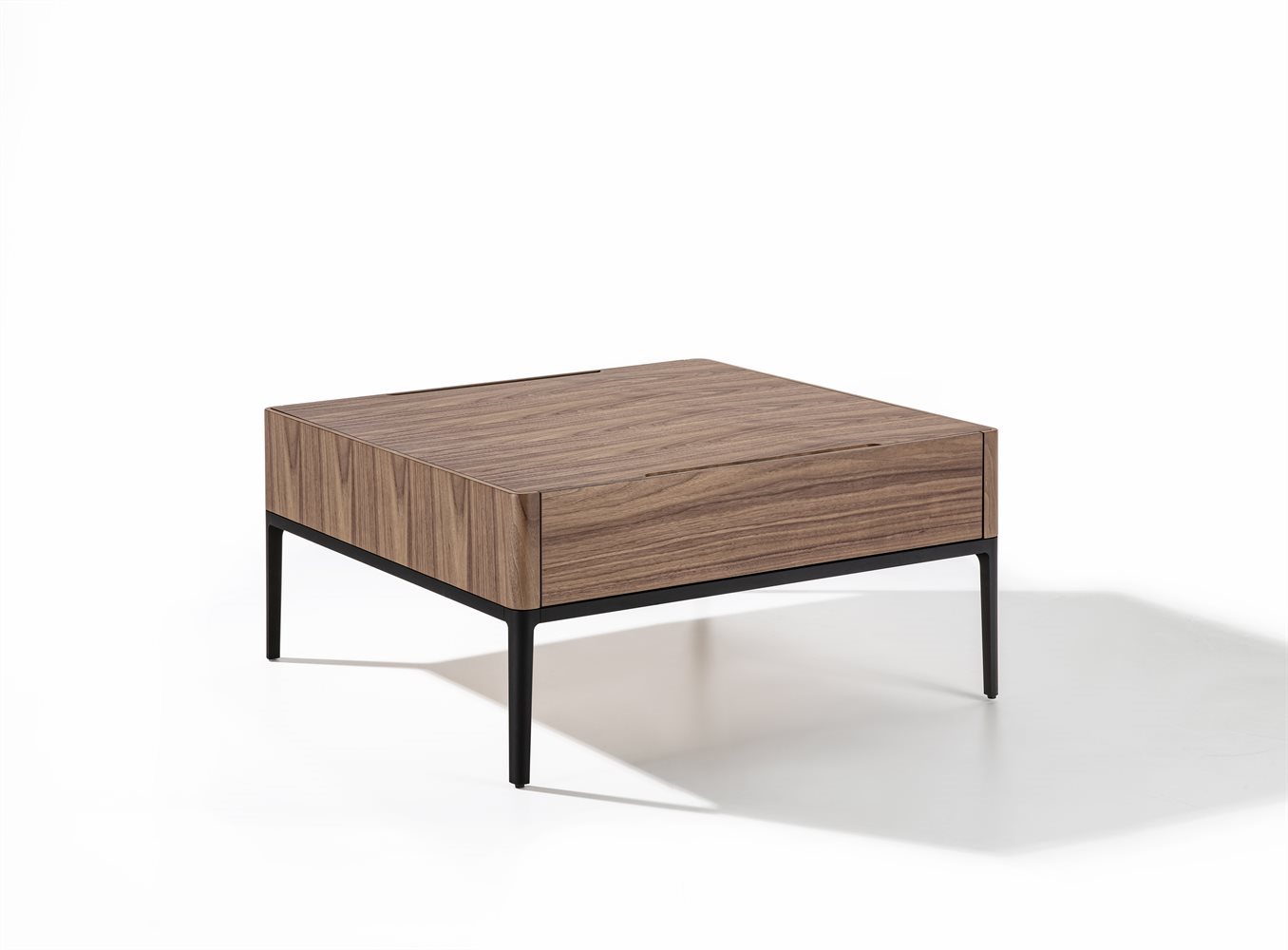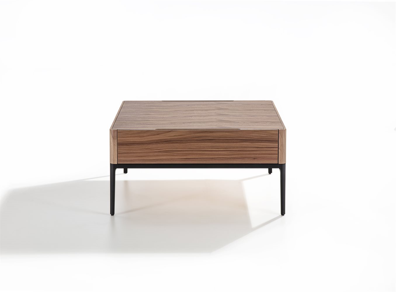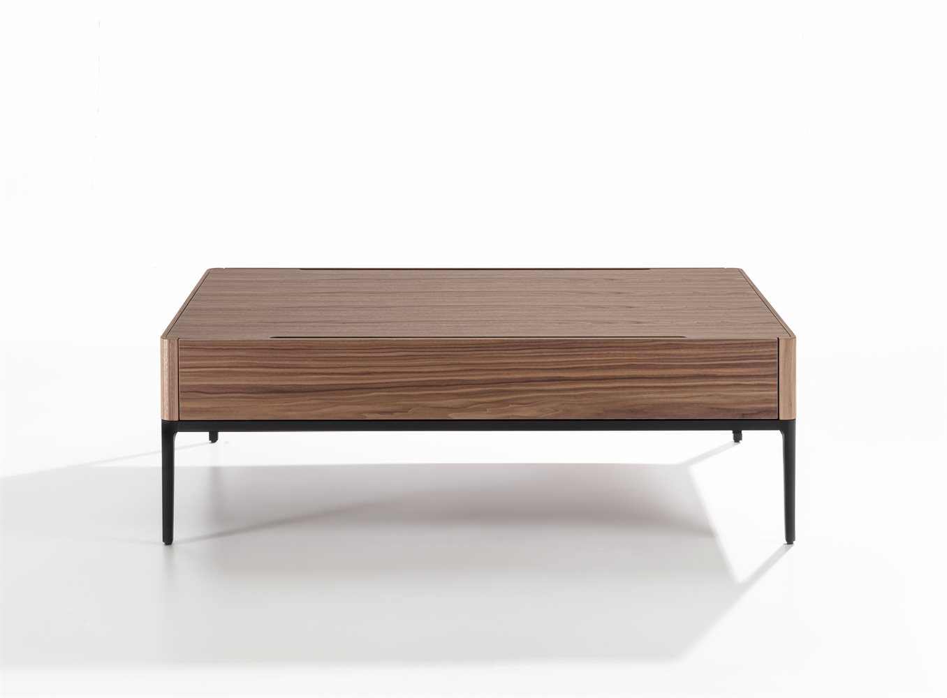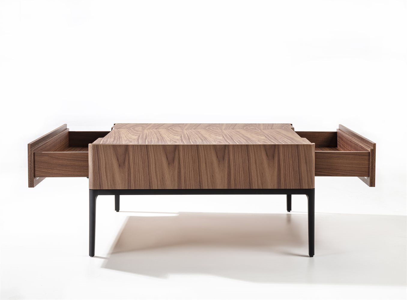 一系列咖啡桌,抽屉在运河核桃。结构为哑光黑色彩绘铝。