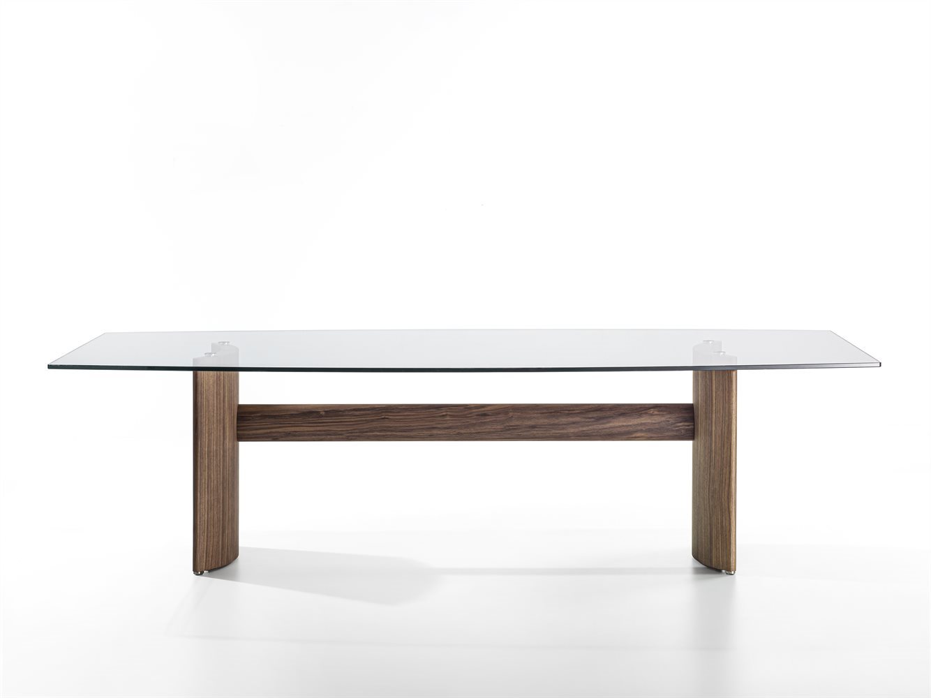 餐桌上有两个半月基地在运河核桃连接中央木梁。顶部为透明玻璃、木材、大理石或岩石。金属提示。