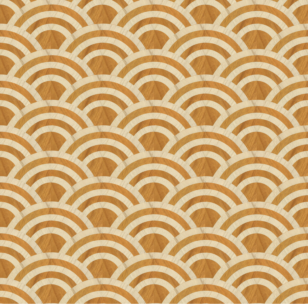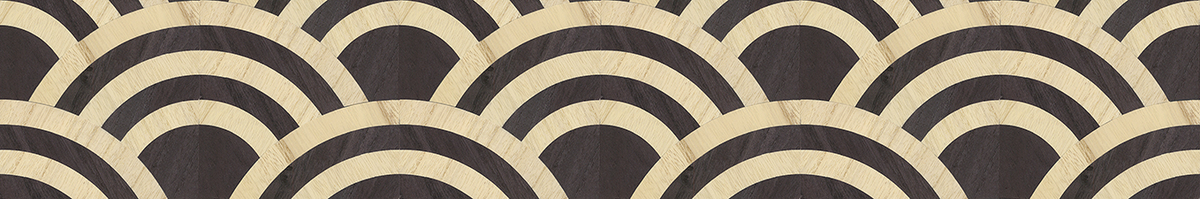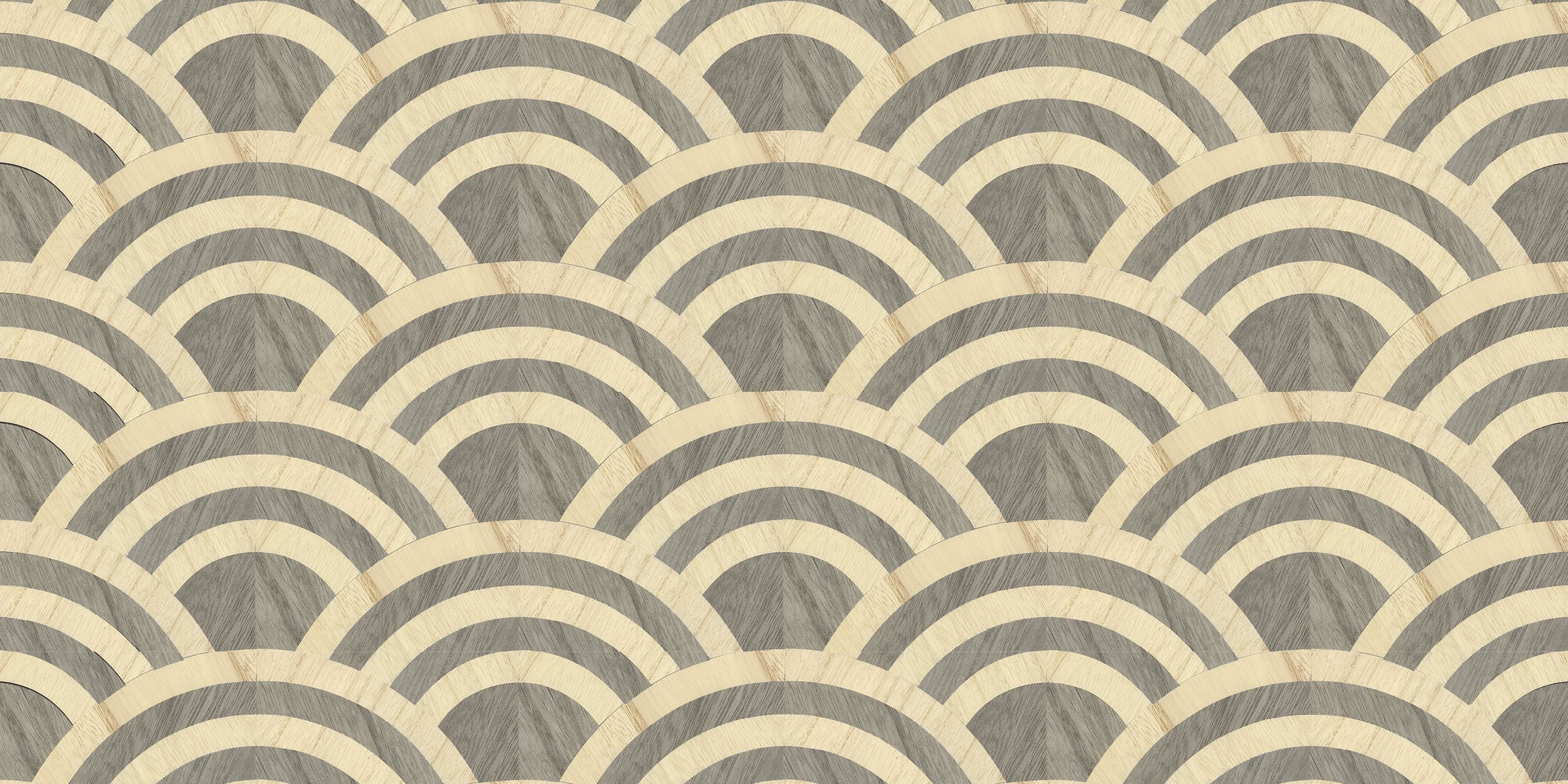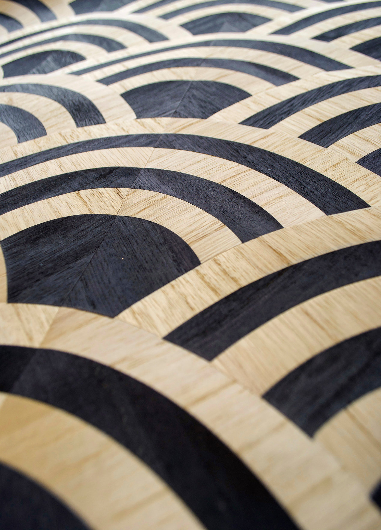 重叠的 O, 由木贴面镶嵌物创建, 类似于海洋的滚动波。独特的壁墙覆盖的古代西盖哈图案象征着水波,代表着好运、力量和韧性。