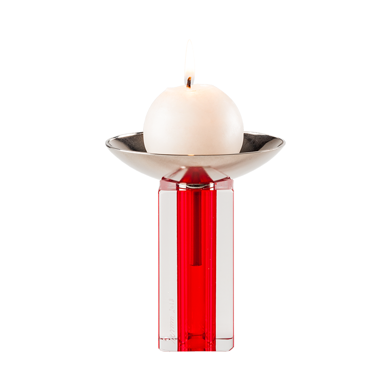 一个水晶色的玻璃茎与红色核心。蜡烛支架旨在最大限度地提高蜡烛的发光,投射无尽的光反射。克制的形状,但雄伟与它的新艺术风格。