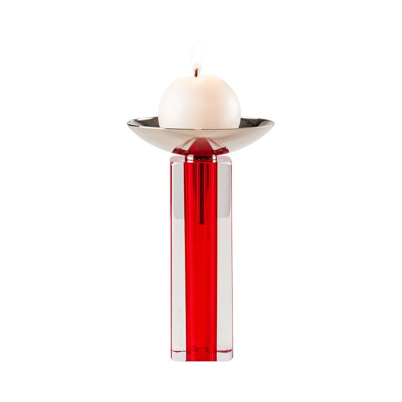一个水晶色的玻璃茎与红色核心。蜡烛支架旨在最大限度地提高蜡烛的发光,投射无尽的光反射。克制的形状,但雄伟与它的新艺术风格。