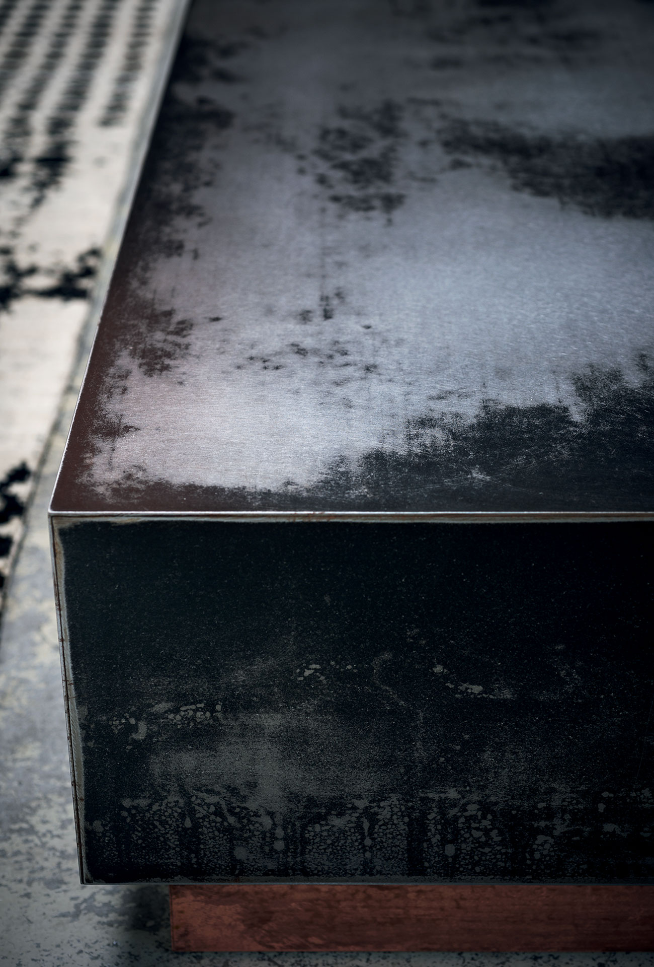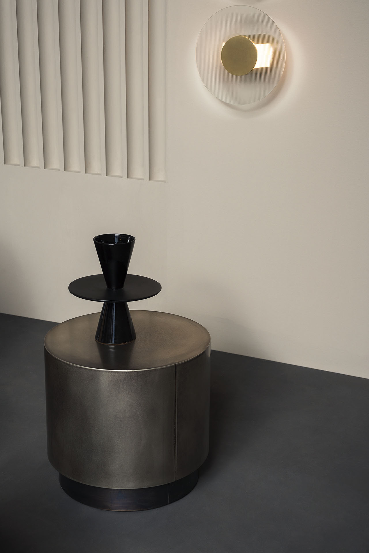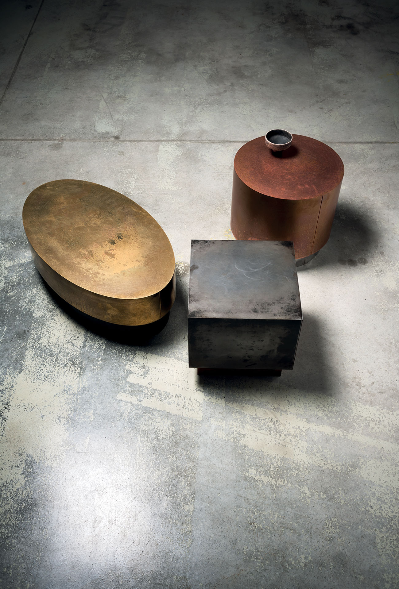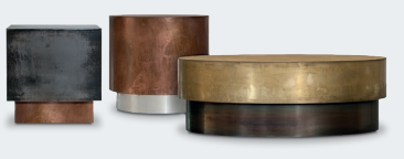 提供四种不同的形状和三种不同的饰面:顶部在古董铁与半光泽古董铜底座,在哑光古董铜与光泽镀铬钢底座,在古董黄铜上衣与抛光黄铜底座。