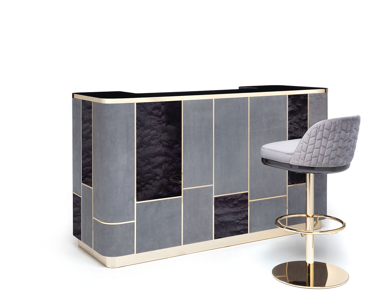 酒吧与前面结合黑色布宾加毛刺贴面与高光泽聚酯完成和灰色 nubuk 颜色 nr 6 。浅金色铬不锈钢的细节和基础。烟熏钢化玻璃的上衣。