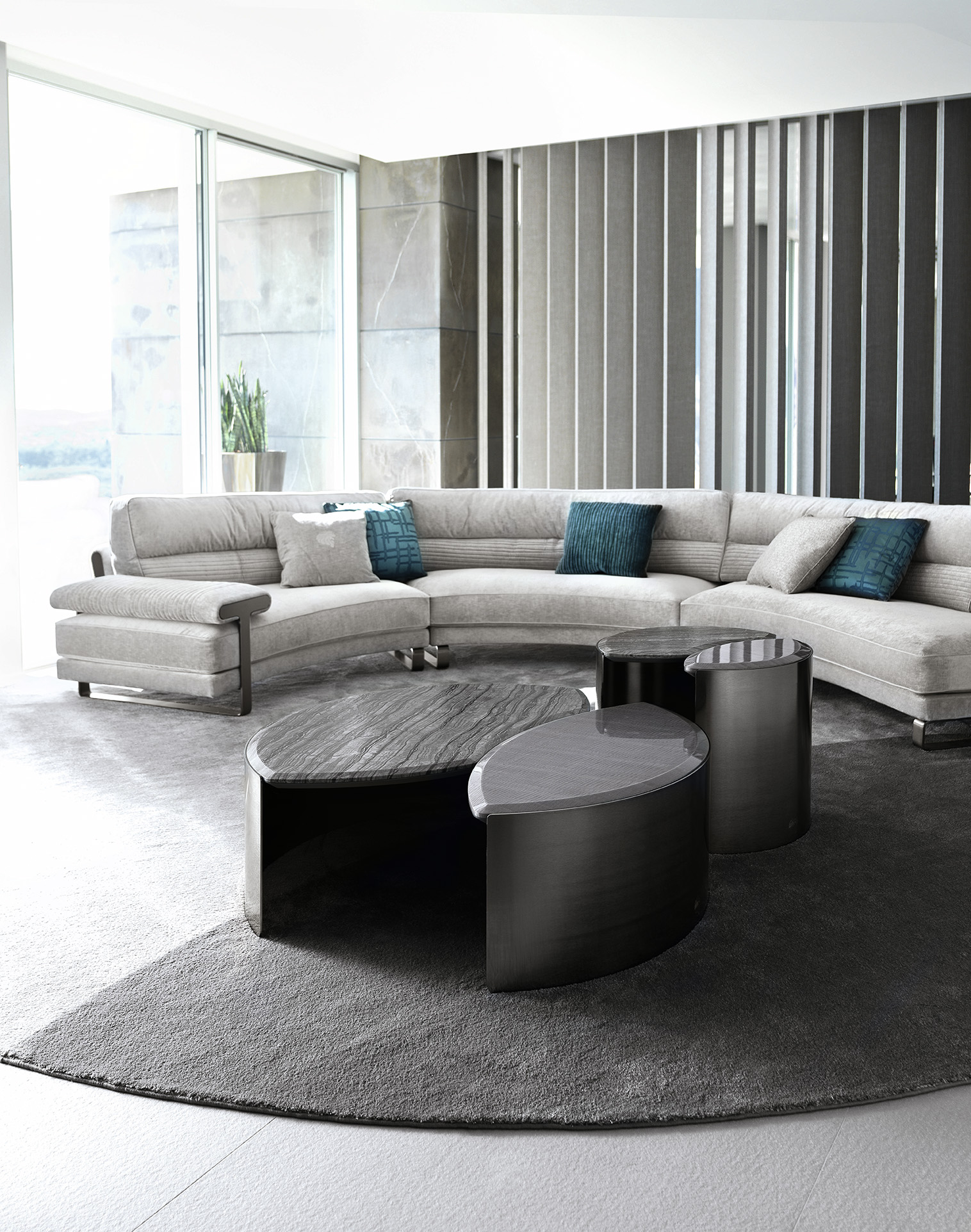 圆形鸡尾酒桌与顶部结合黑色肯尼亚大理石和马达加斯加认为莫温吉贴面在高光泽聚酯完成。缎黑色镍不锈钢的弯曲腿与激光乔治收藏标志。