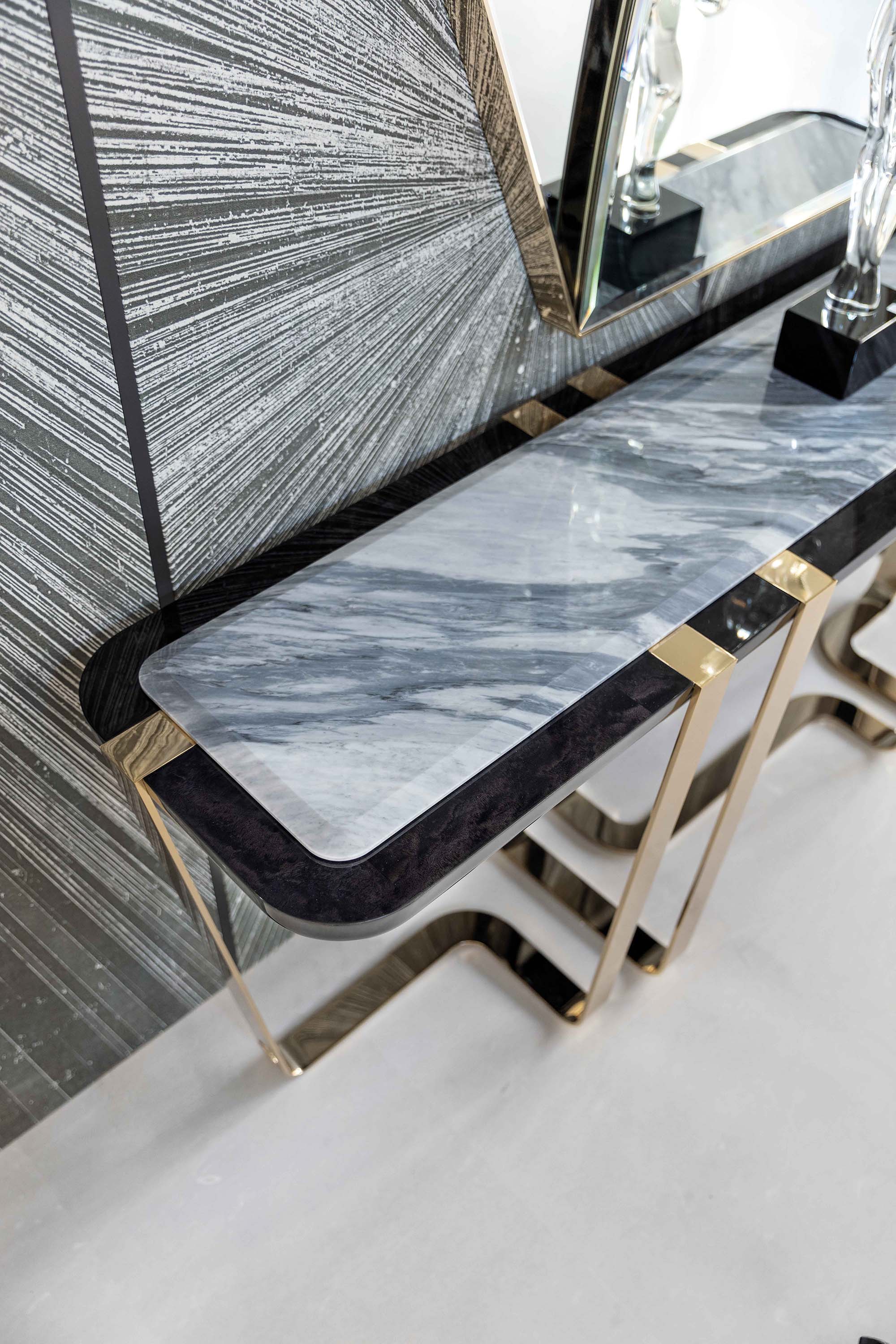 黑色布宾加毛刺贴面控制台,具有高光泽聚酯饰面。底座采用浅金色镀铬不锈钢制成。