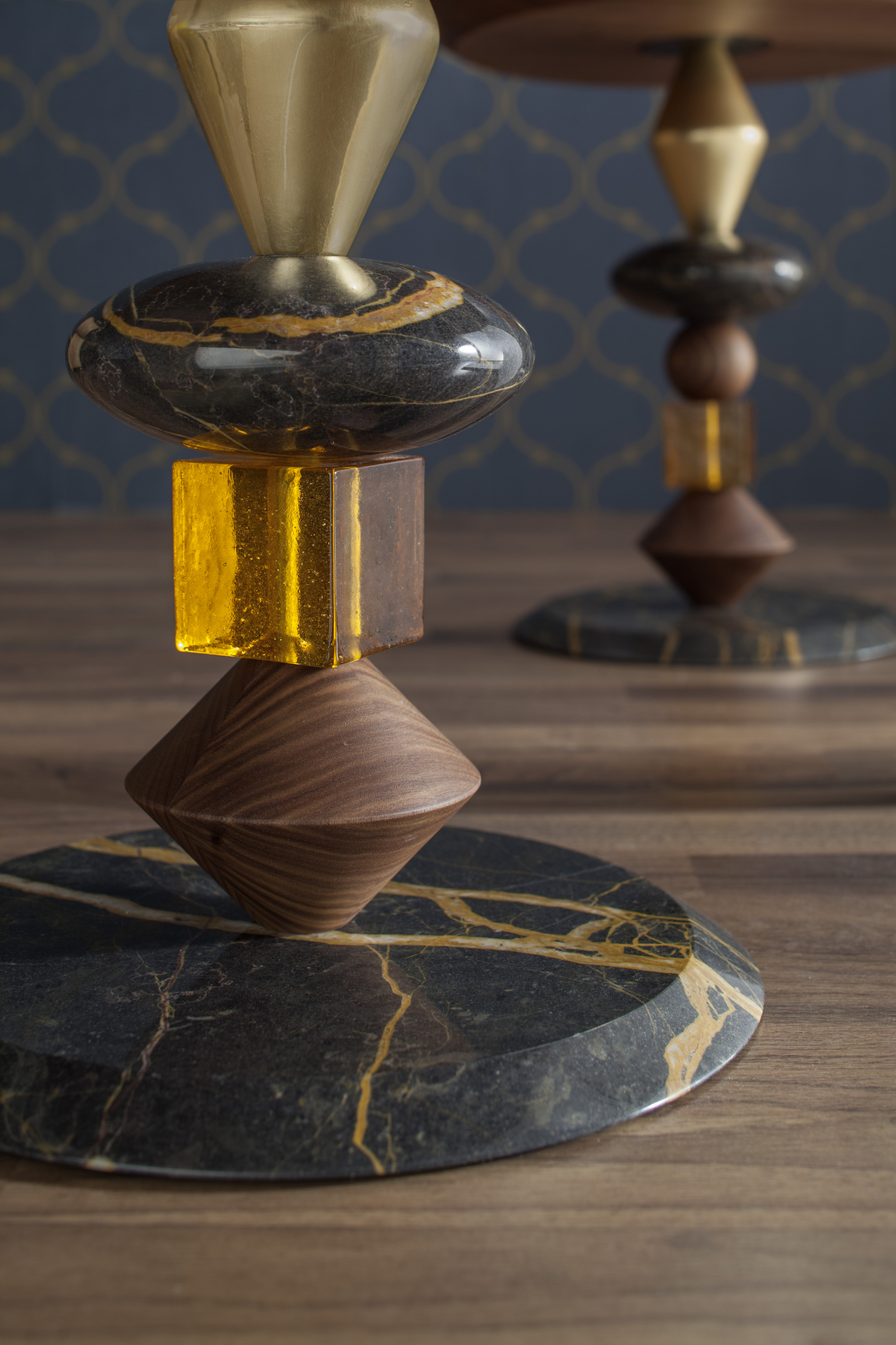 从大理石底座开始,然后采用各种实木元素、铸玻璃、金色饰面细节和漂亮的木制台面。