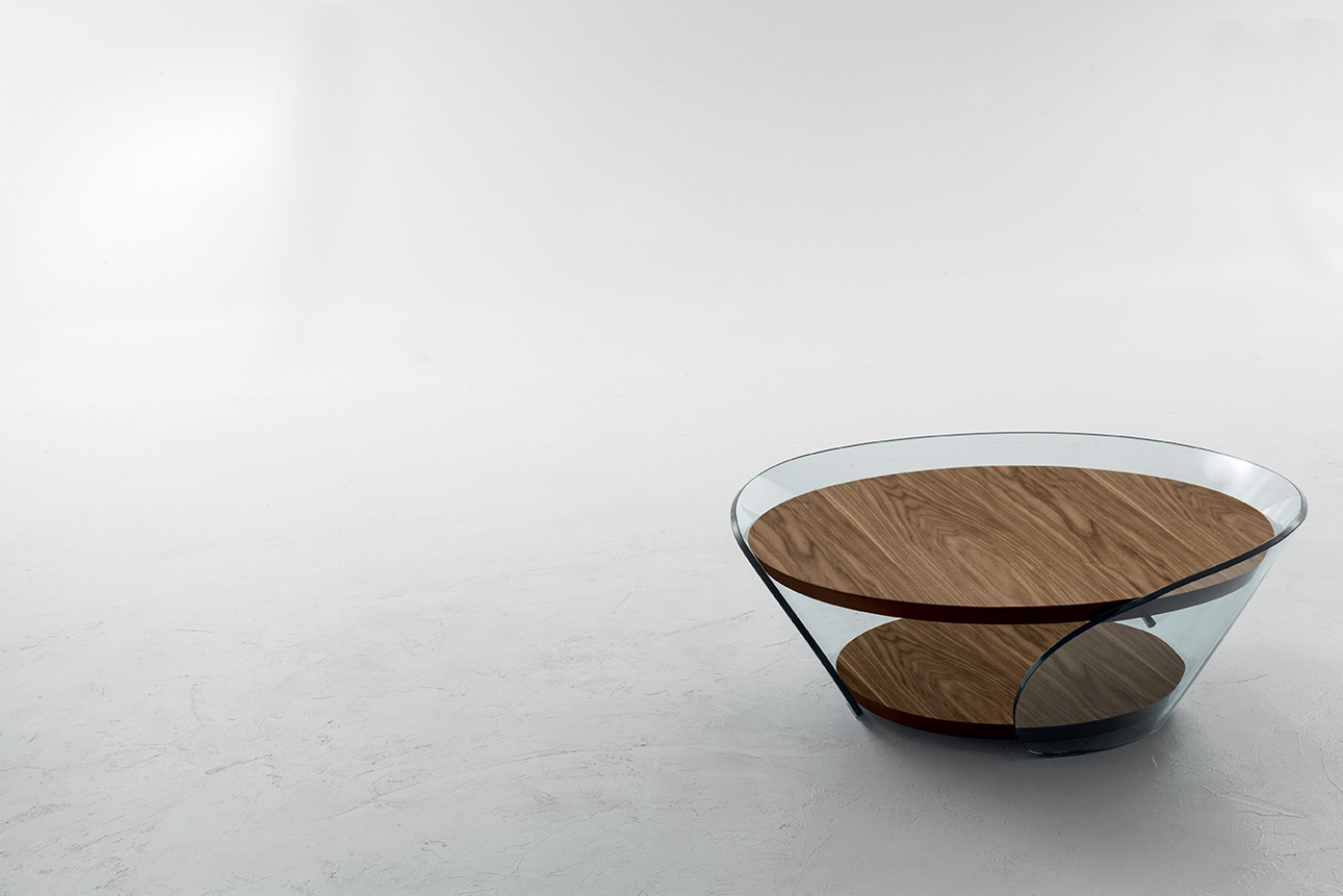 Raffaello 代表了一种精心制作的技术的结果,它允许创建一个锥形、坚固和紧凑的弧形玻璃底座。两个深色橡木或卡纳莱托胡桃木架子标志着托宁·卡萨 (Tonin Casa) 始终和无论如何都要通过材料和效果的组合进行实验的愿望。