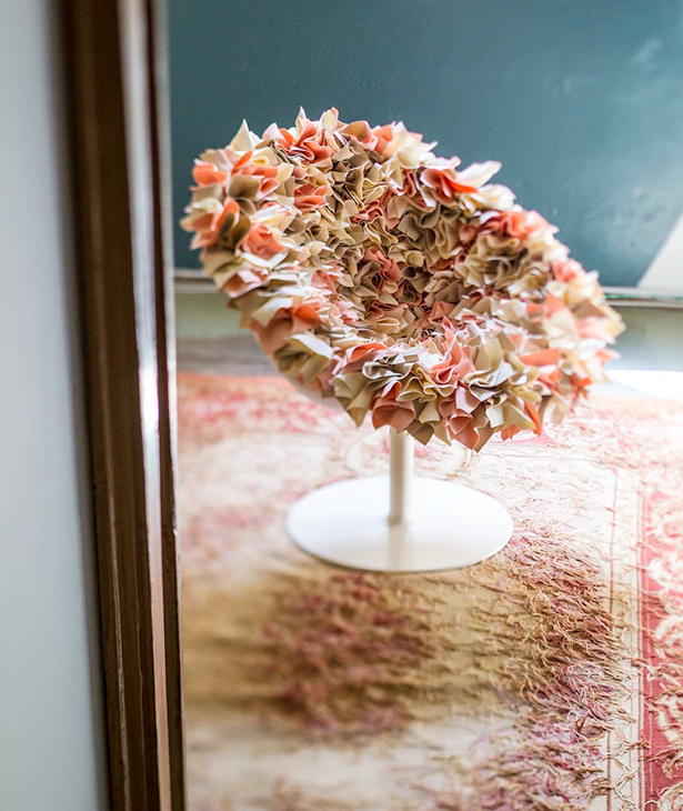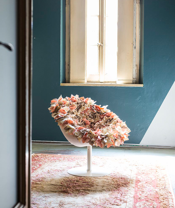从薄薄的铬金属茎绽放出一束花瓣,由手工折叠的织物方块形成,并以娴熟的护理和无限的耐心逐一缝制。向美致敬,在重复的手势的简单性中触及精神层面,揭示视觉与真实形象之间的局限性。花瓣连衣裙以鸡蛋的形状包裹在壳体上,直到完全覆盖内侧。在工业设计的物质对象中,梦想的寓言,精致的诗意转换。扶手椅让坐在那里的人们开心,就像鲜花让接受花的人满意一样。
