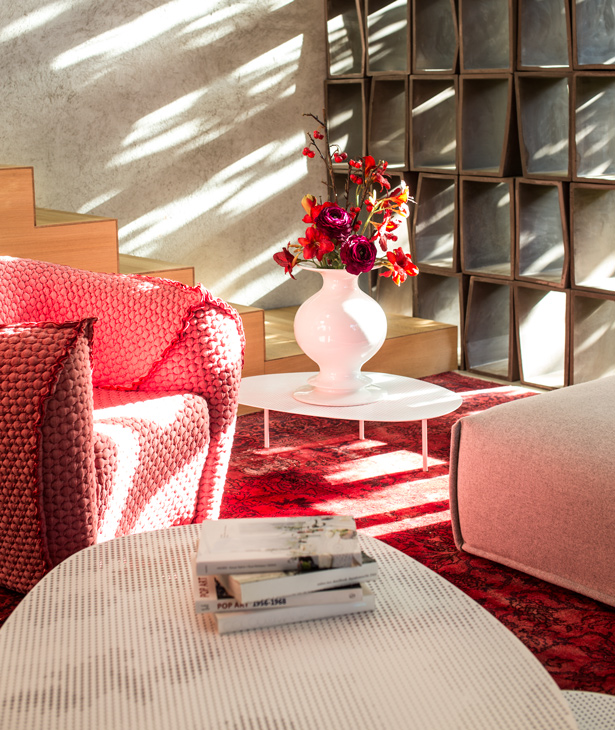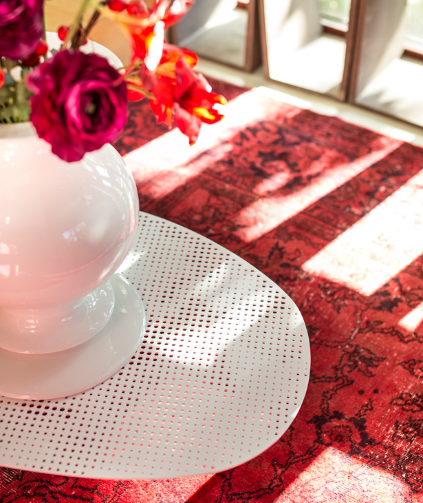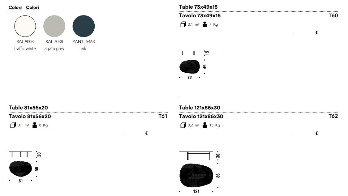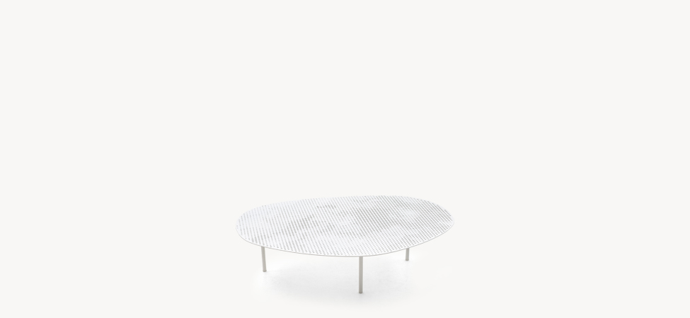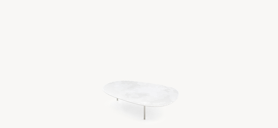 一套带穿孔钢顶的咖啡桌。粉末涂层和涂漆钢脚。聚丙烯鞋垫。