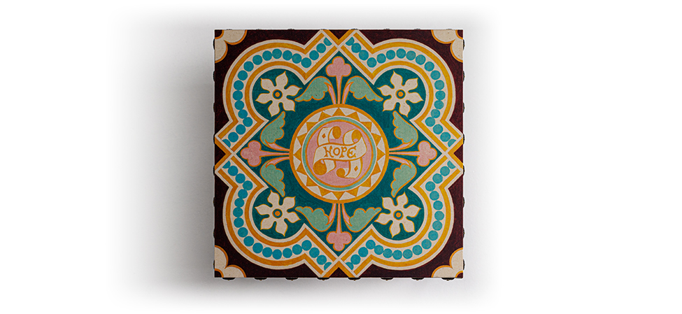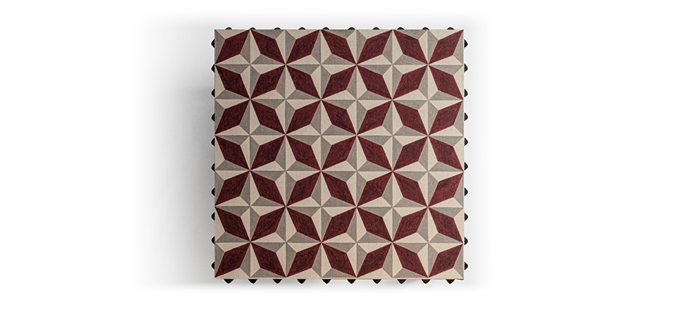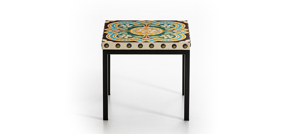 小桌子不是兔子的特点是黑色金属底座,由顶部超越,画布上印有摩尔瓷砖的设计。咖啡桌上装饰着抛光螺柱。