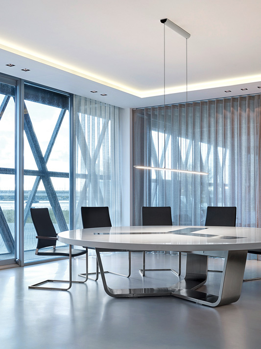 太空中的雕塑:建筑师哈迪·德黑兰尼的会议桌系统S 8000将高功能与完美的质量和视觉轻盈相结合。像丝带一样,优雅的金属底座支架继续在桌面表面,在那里它成为一个功能表面 - 中央元素。多媒体模块可以单独集成。电缆在支撑基结构中无形中运行。