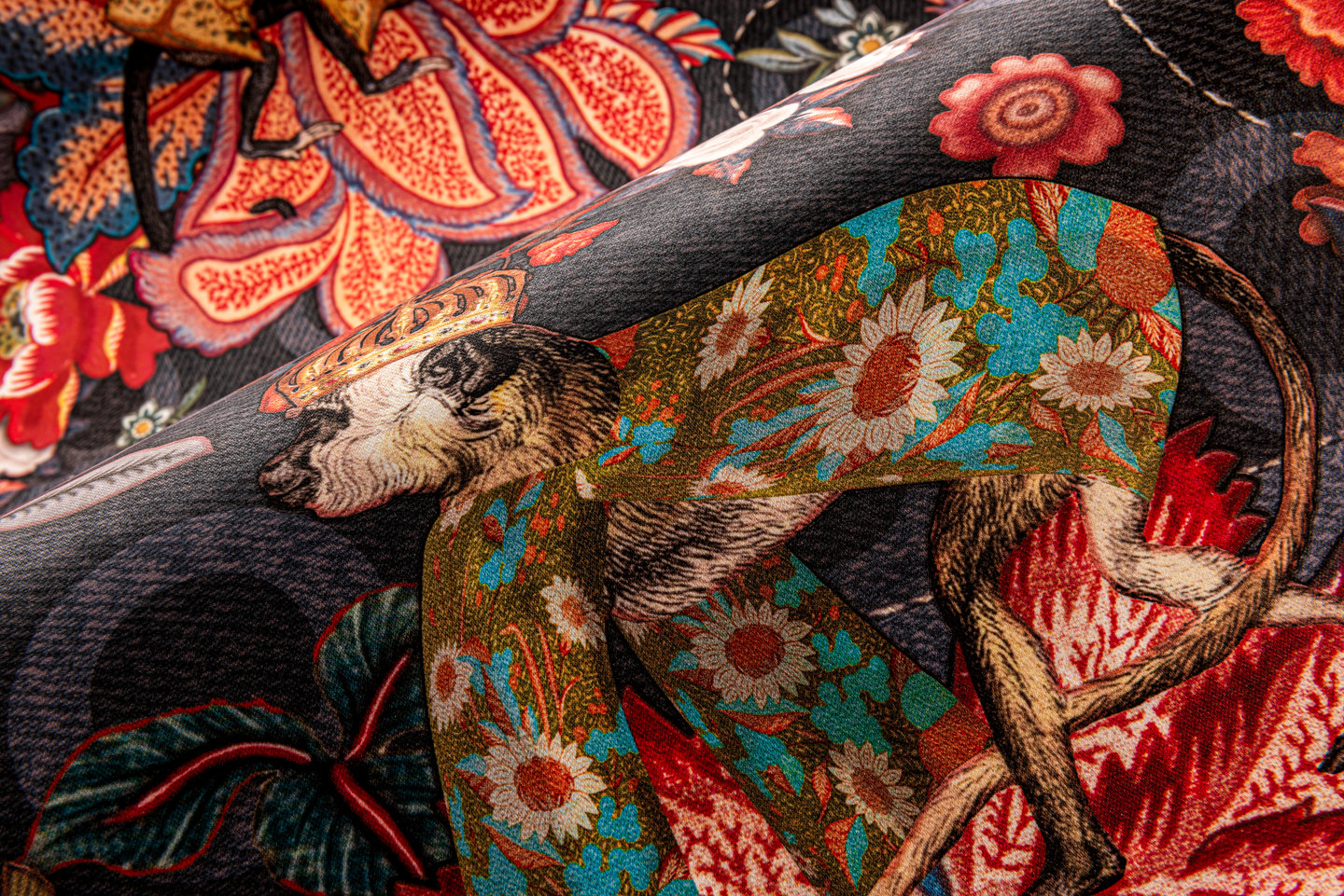 印在柔软和天鹅绒表面面料与牛仔纹理,这个活泼的墙面描绘郁郁葱葱的森林充满了生活和运动。仔细观察后,可以发现身着传统和服的蓝蓝马卡克斯在盛开的异国花卉之间。
