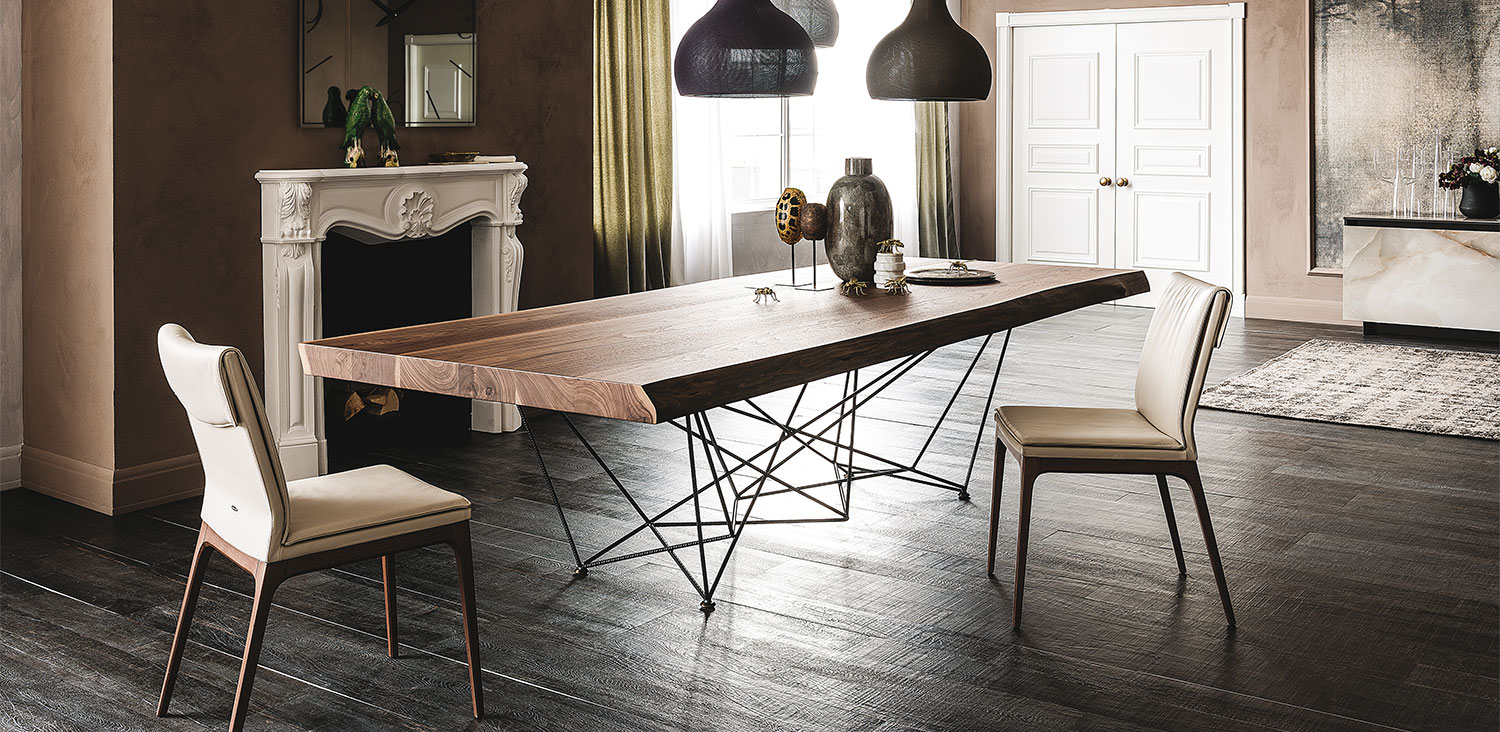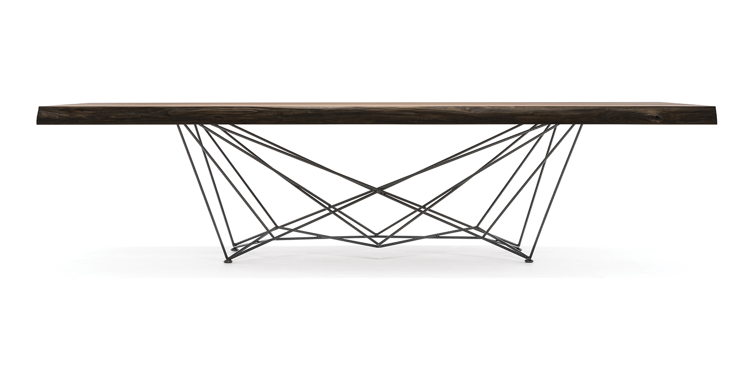表带钛 (GFM11)、石墨 (GFM69)、白色 (GFM71) 或黑色 (GFM73) 压纹漆钢底座。8 厘米厚的木质台面,带有不规则的卡纳莱托胡桃木 (NC) 实木边缘。由于顶部加工的复杂性,无法实现特殊的饰面或尺寸。
