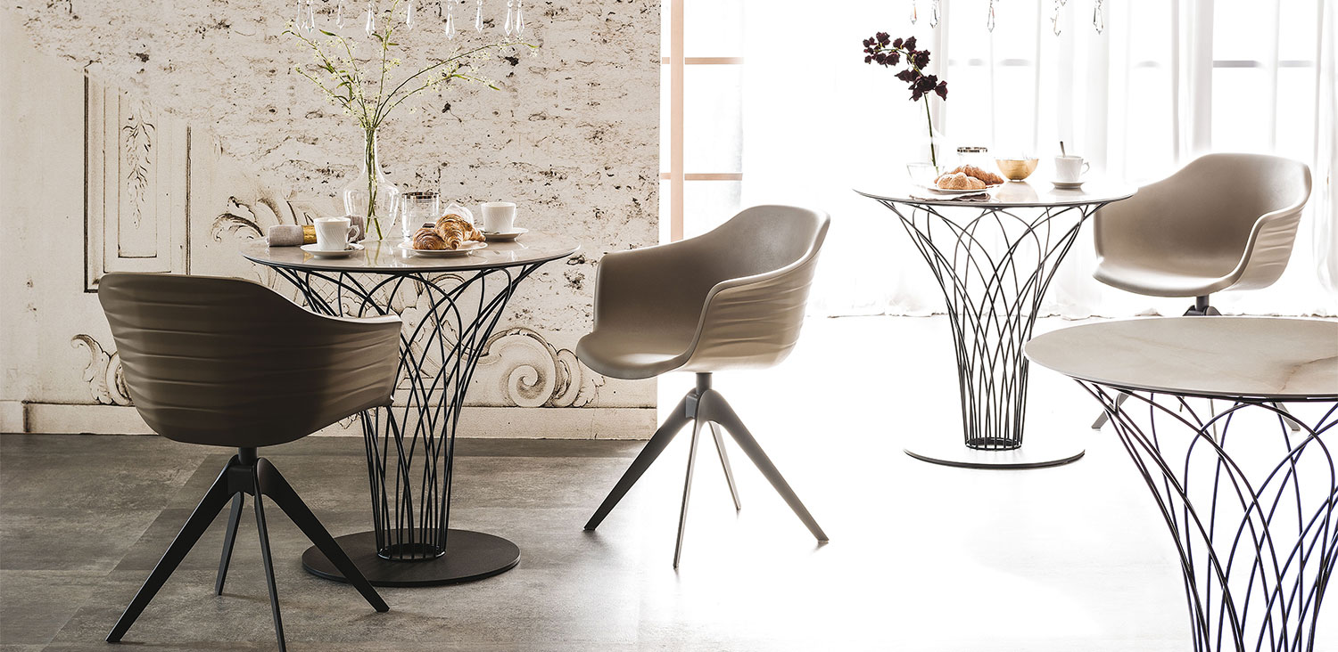 在爱妮岛KERAMIK Bistrot餐厅表,由Brogliato特拉韦尔索工作室设计的,是自然的灵感和优秀的生产技术的完美结合。由涂漆钢底座创造的图案具有轻盈和谐的设计,增强了这款精致吧台Marmi陶瓷台面的众多精致细微差别。最初被设想为用于合同室内设计项目的咖啡桌,它们有两种高度可供选择。根据不同的造型需求,它们可以与椅子相结合,也可以为优雅的小酒馆提供带凳子的高桌。