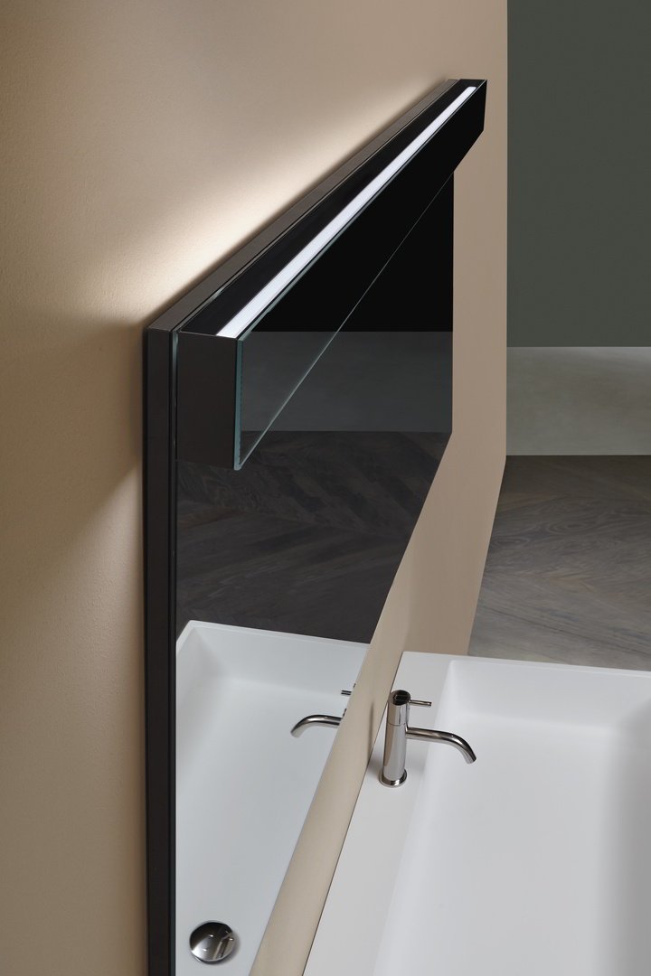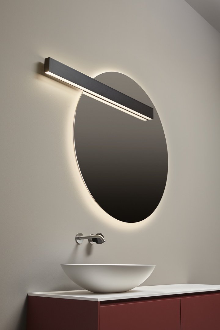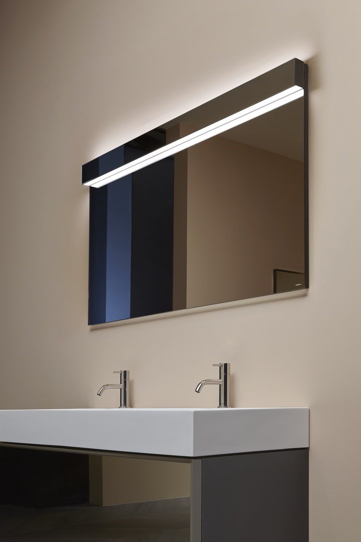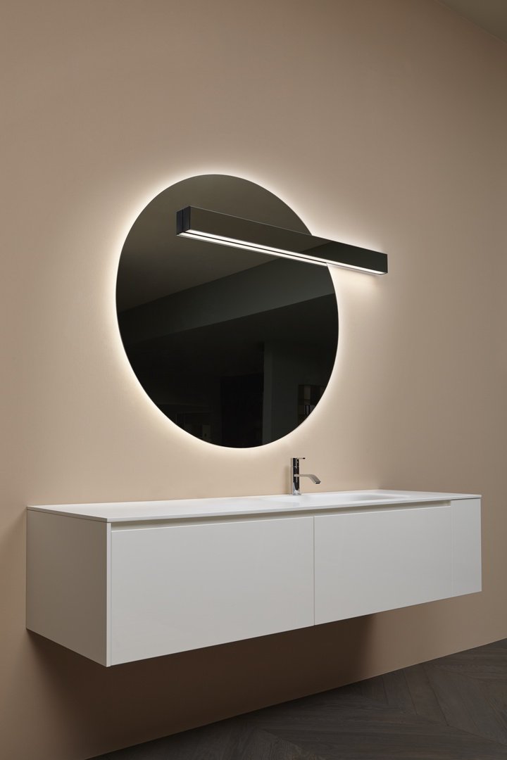 配备直接和间接 LED 照明,它可以呈现与镜子相同的宽度,真正完整地集成在一起。双灯让您可以在顶部营造氛围灯,并完美照亮下方的镜子。以光和反射为主角的最小解决方案。