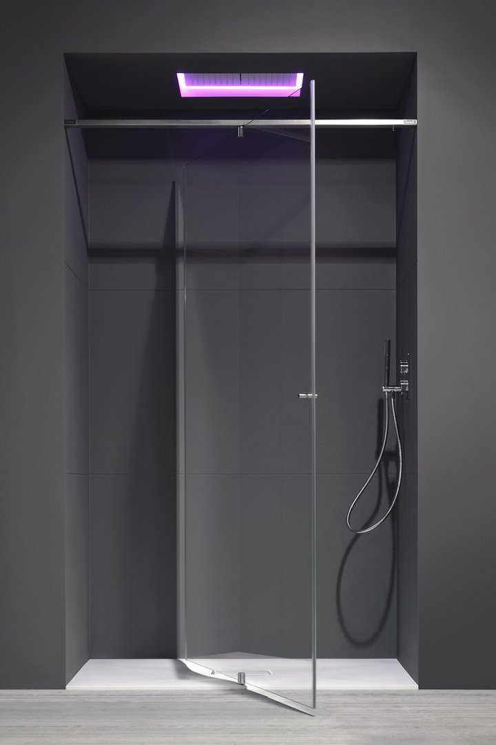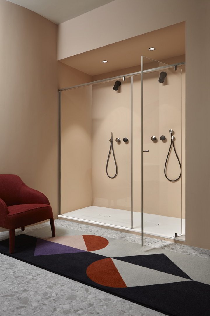Bilico 是一个模块化的淋浴房方案,具有基本的美学设计。由大片玻璃和支撑结构元件的支撑杆制成。该产品以门的运动命名,并允许完美进入淋浴间。