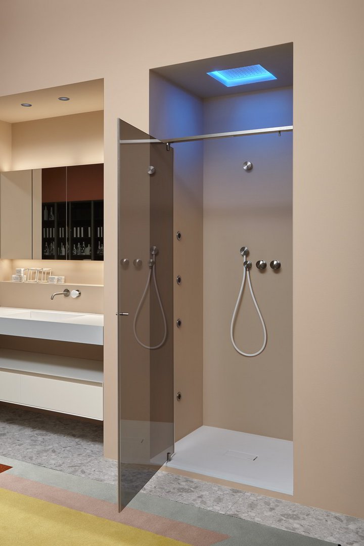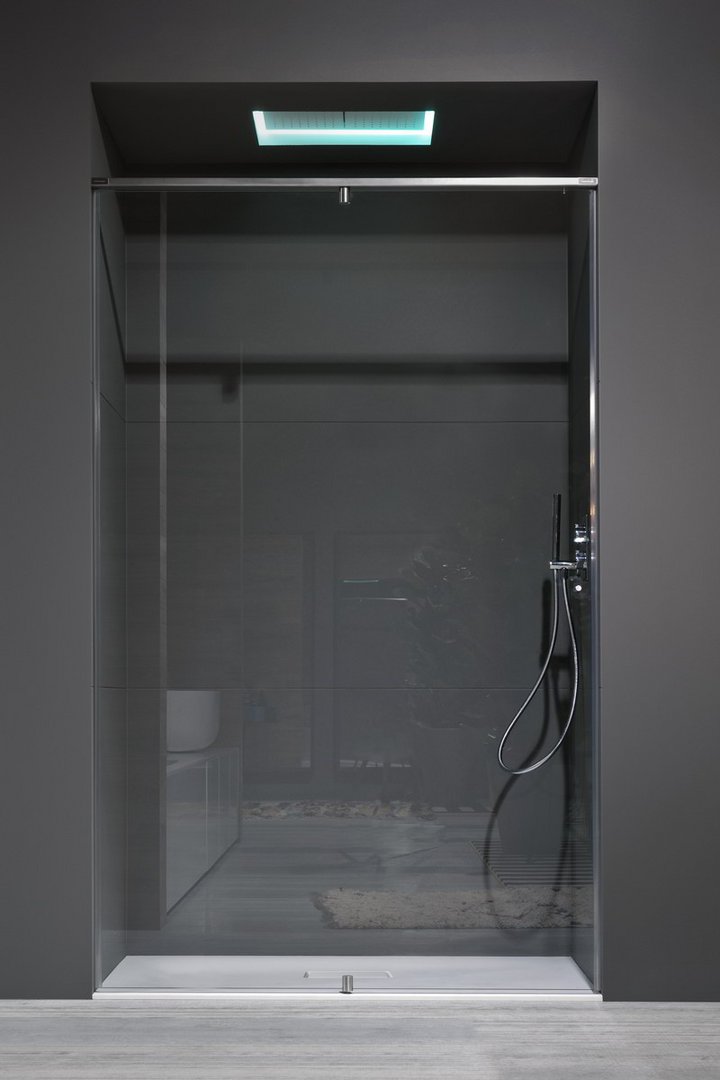 可用于多种尺寸或角落的凹陷区域。Bilico 有两种解决方案;一个带有偏心旋转,另一个中心用于较大的门。移动门可以与固定玻璃结合使用,既可以采用印有原始装饰的丝网,也可以用于 ILBagno 系列。