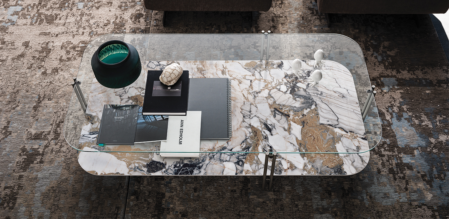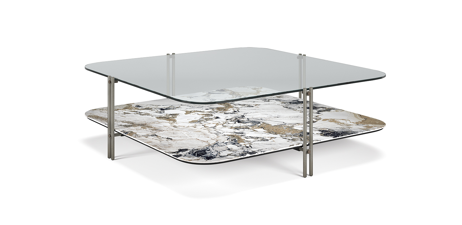咖啡桌采用压纹钛 (GFM11) 或黑色 (GFM73) 喷漆钢结构。透明或烟熏玻璃上部顶部和 Marmi Ardesia (KM04)、Emperador (KM10)、Makalu (KM11)、Breccia (KM12) 或 Arenal (KM13) 陶瓷下部顶部。黄铜细节。