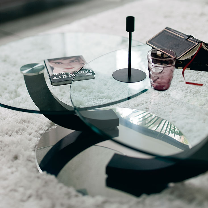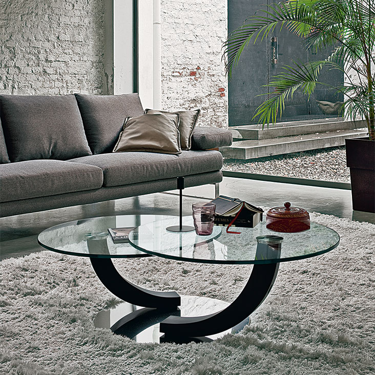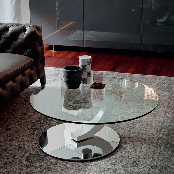 带抛光不锈钢底座的咖啡桌。一两个可旋转的透明玻璃台面。卡纳莱托胡桃木 (FNC)、wenghè (FW)、白色 (OP7) 或黑色 (OP17) 脚。