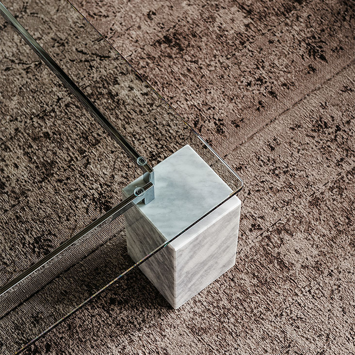 咖啡桌底座采用白色 Carrara (BC) 或黑色 Marquina (NM) 大理石制成。镀铬 (08) 或黑色 (OP17) 金属条。透明玻璃顶。
