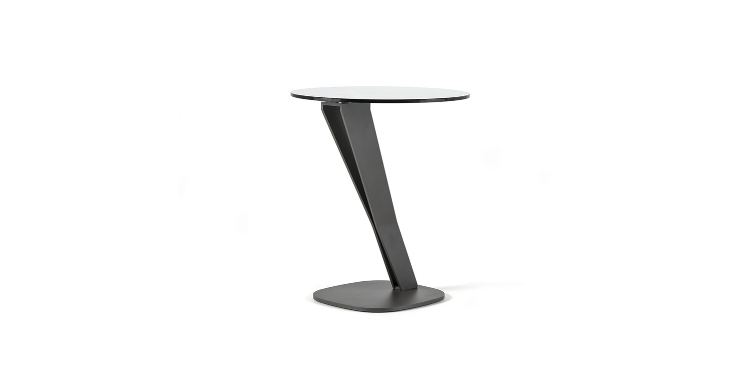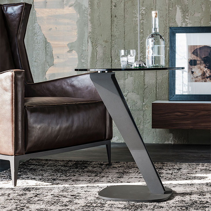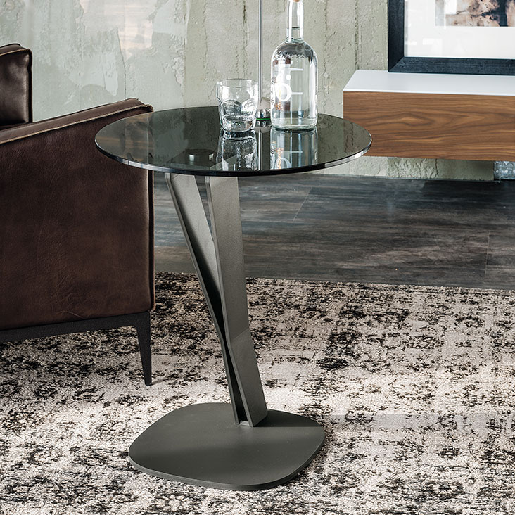 沙发边桌采用石墨 (GFM69) 压纹漆钢底座。透明或烟熏玻璃顶部。