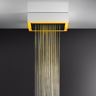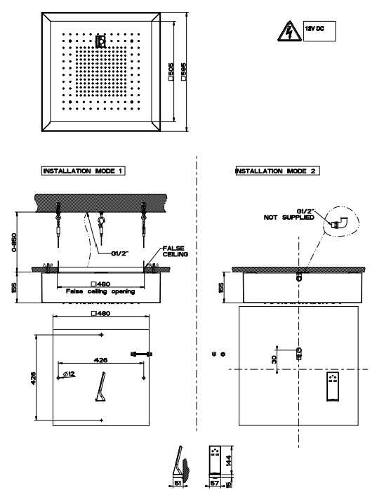 500x500 暴露淋浴系统,具有雨量功能和色谱治疗效果,用于天花板/假天花板安装,并带有 wh ite 框架。电子部件包括远程防水控制和挂钩。要与 12V 电源匹配,不包括在内。要用封面完成(无插曲)