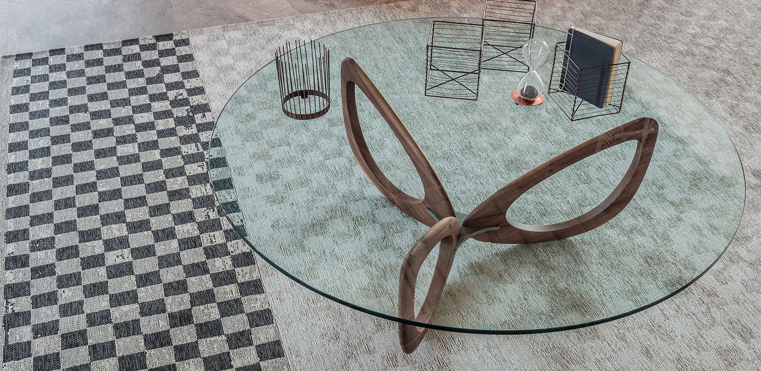 咖啡桌采用实心胡桃木 (NC) 和透明漆钢 (OP0) 底座。透明玻璃顶。