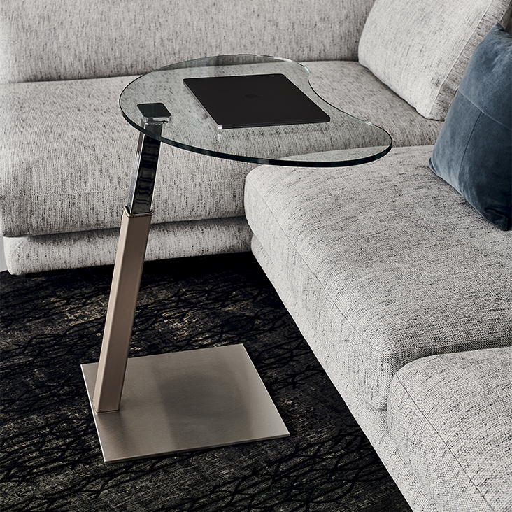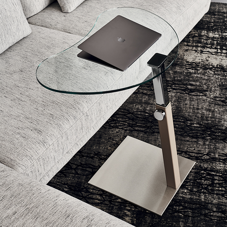 可调节高度的边桌或膝上型装置。顶部采用矩形或异形 12 毫米透明玻璃。缎面不锈钢底座,带镀铬腿或根据样品卡覆盖皮革。