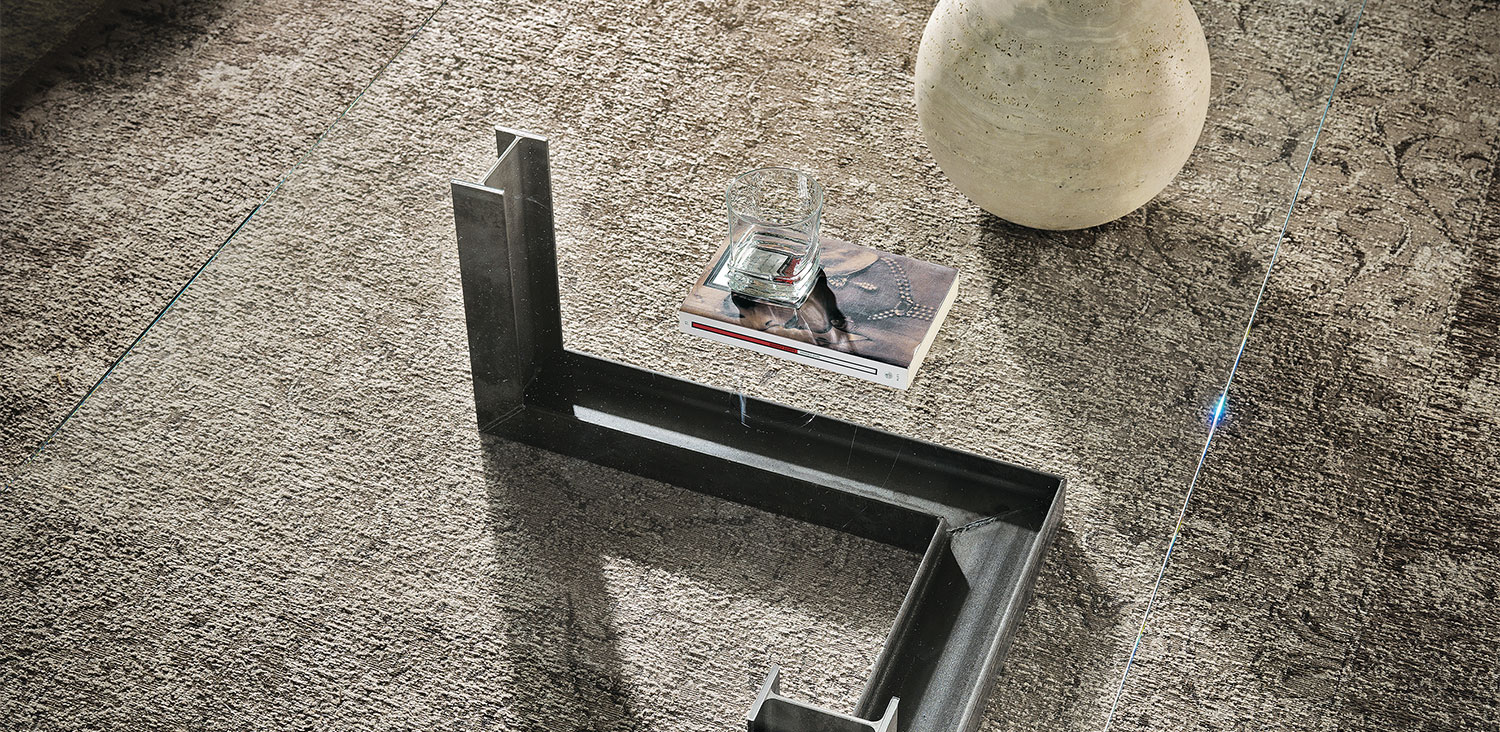 带透明漆金属底座 (OP0) 和石灰华 (TN) 球体的咖啡桌。顶部透明玻璃。底座 OP0 的饰面标识了黑色原材料上的透明涂层。存在或多或少明显的污点、颜色变化、划痕和不规则边缘是特殊材料加工的特征,不应视为缺陷。
