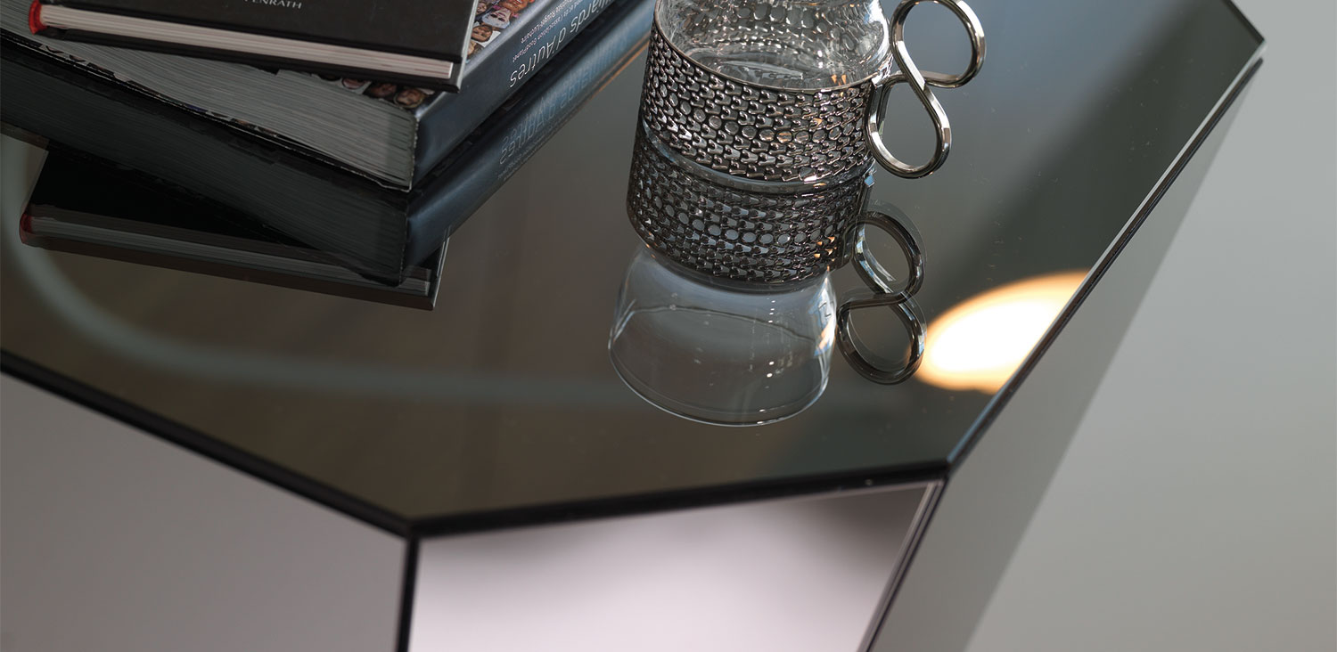 咖啡桌完全覆盖着镜面玻璃或烟灰色镜面玻璃。