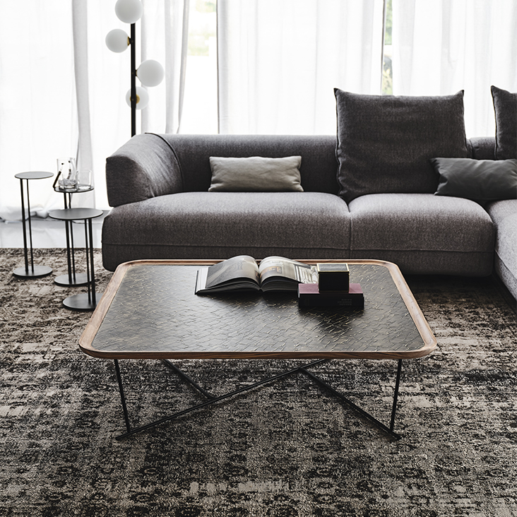 咖啡桌采用黑色 (GFM73) 压纹漆钢结构。顶部用 Canaletto 胡桃木 (NC) 实木框架刮刀。纹理效果是手工制作的。每一块都是独一无二的。