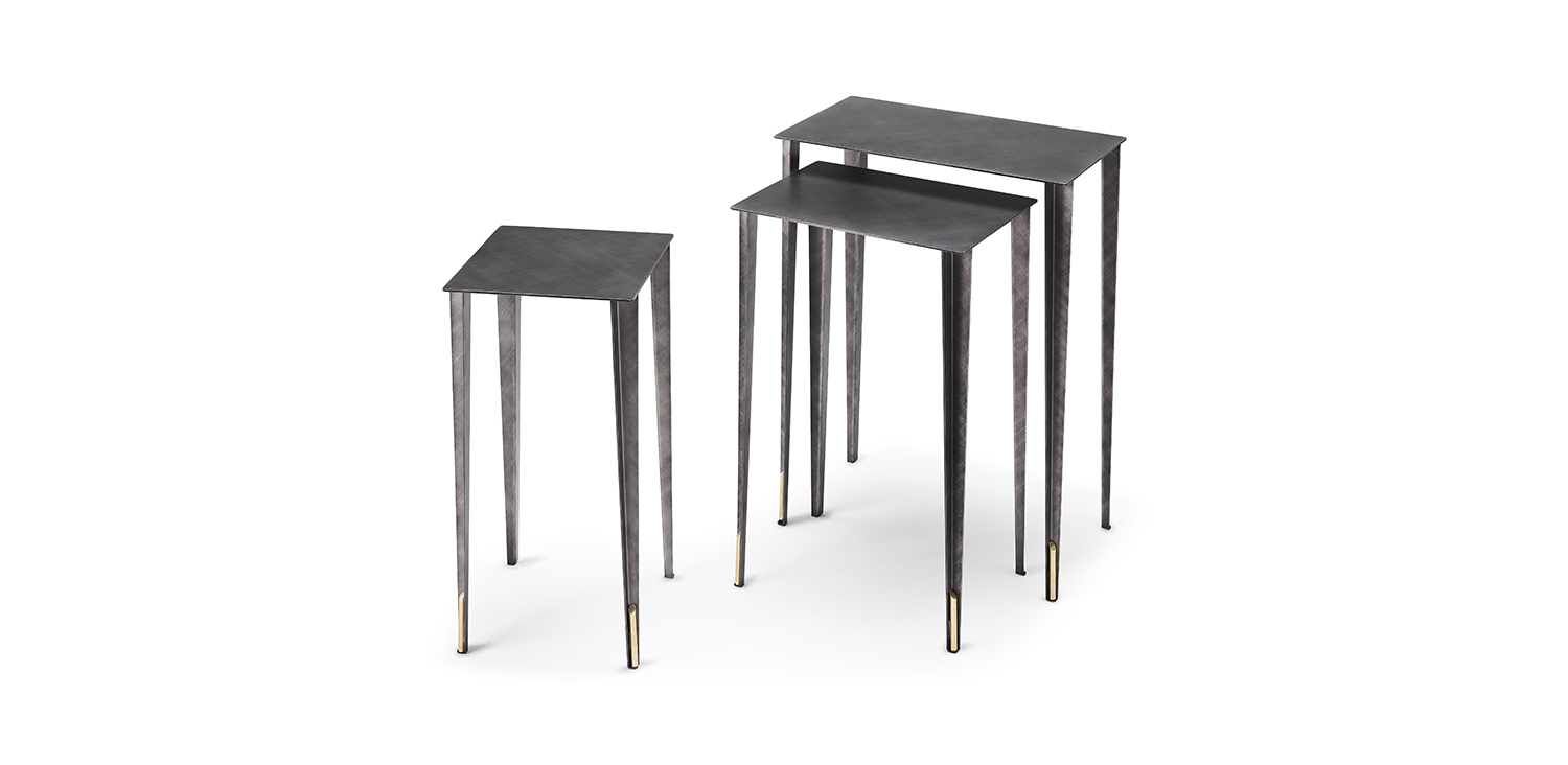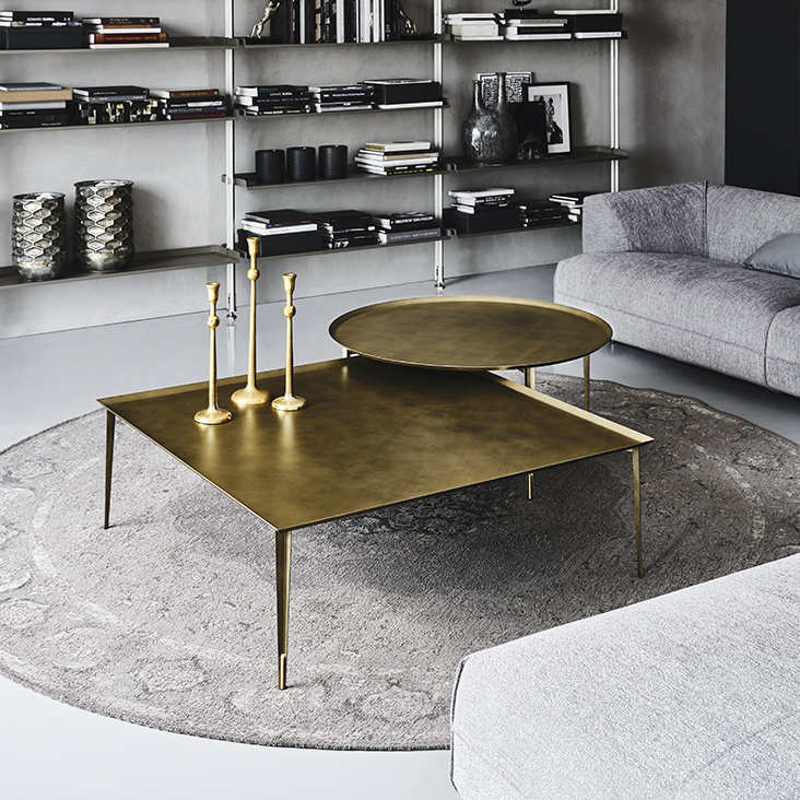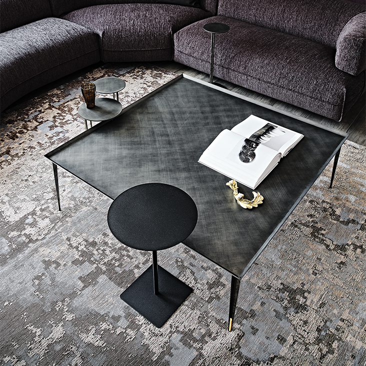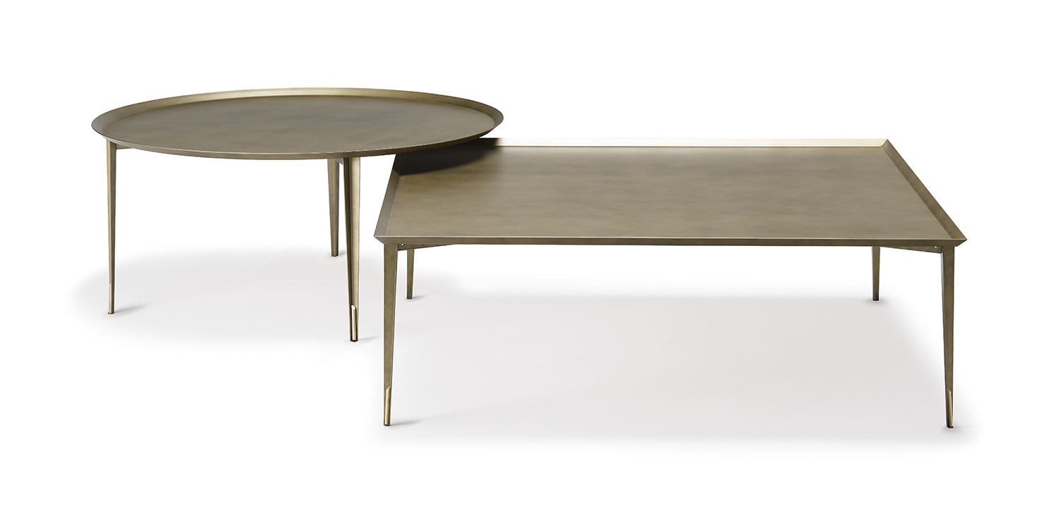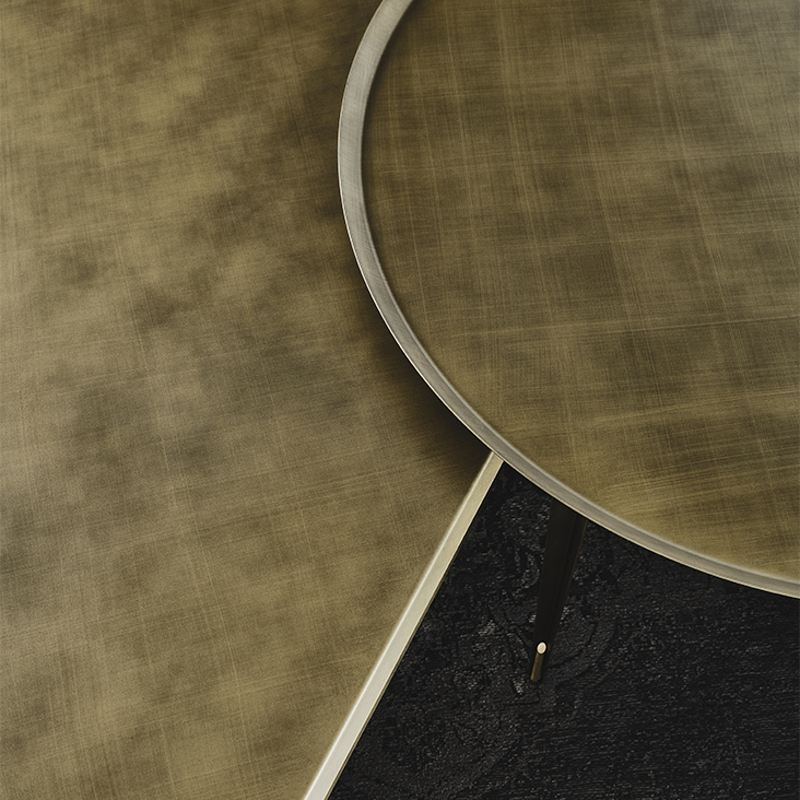 咖啡桌采用拉丝黄铜、拉丝青铜或拉丝灰色漆钢和黄铜细节结构。