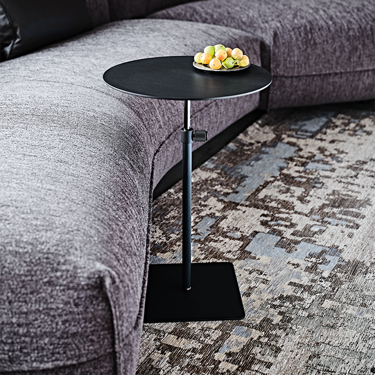 可调节咖啡桌,底座、桌腿和桌面采用钛 (GFM11) 或黑色 (GFM73) 压纹漆钢、拉丝黄铜或拉丝灰色。黑色铬 (06) 钢阀杆。
