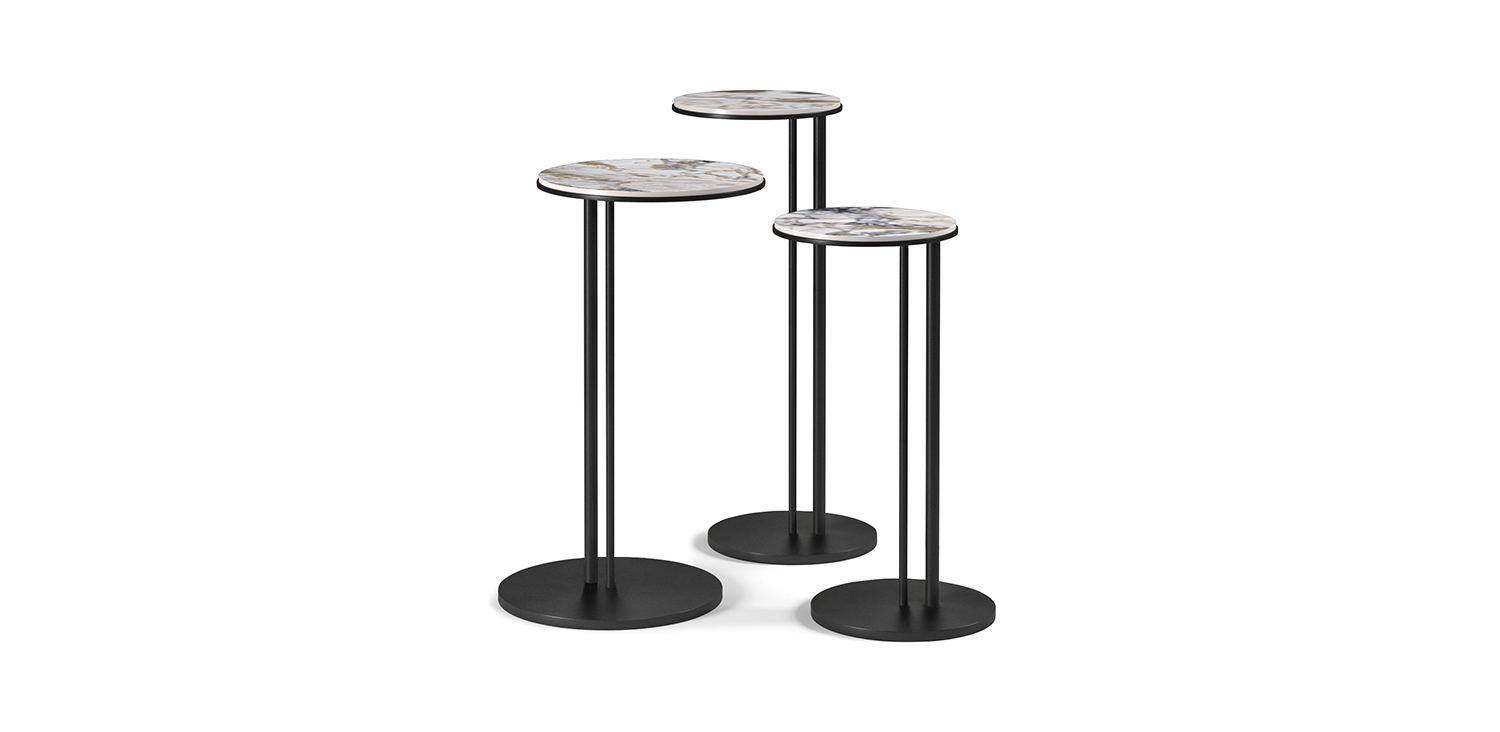 咖啡桌底座材质为钛 (GFM11)、青铜 (GFM18)、石墨 (GFM69) 或黑色 (GFM73) 压纹漆钢。Marmi 陶瓷 Ardesia (KM04)、哑光 Portoro (KM07)、亮面 Portoro (KM08)、Emperador (KM10)、Makalu (KM11)、Breccia (KM12)、Arenal (KM13) 或 Zefiro (KZ20) 顶部。