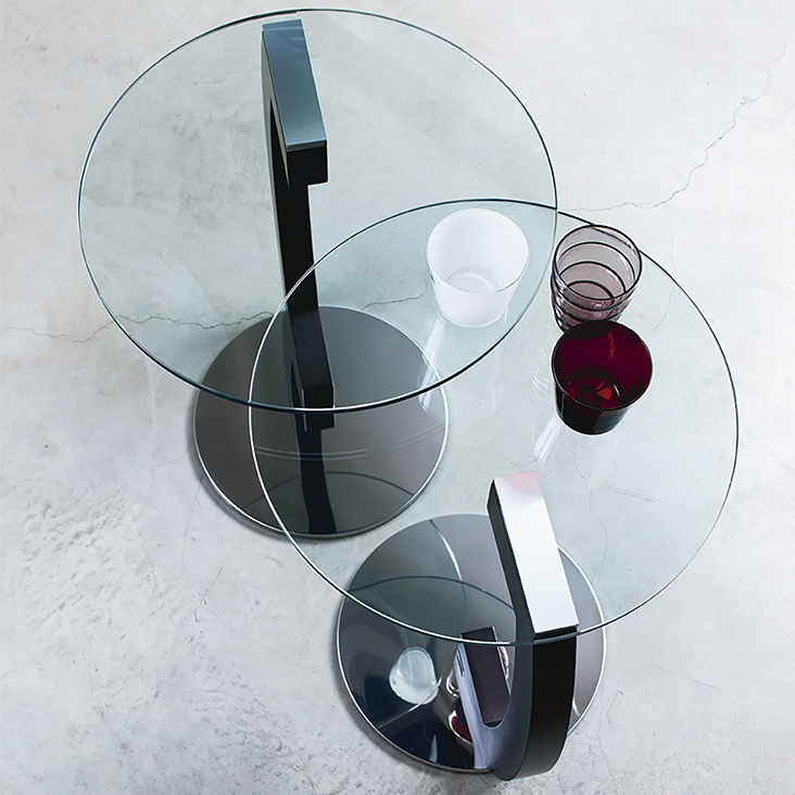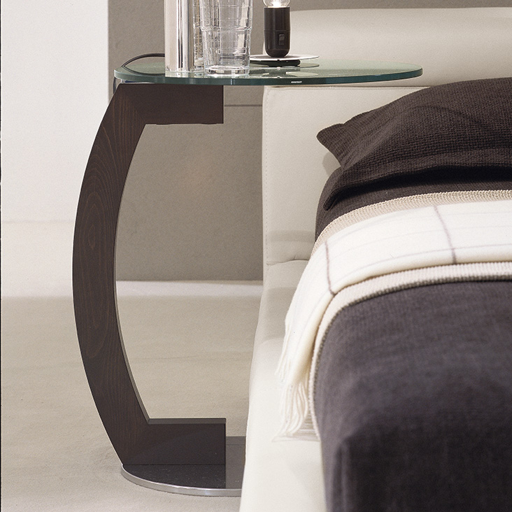 边桌配有抛光不锈钢底座和 wenghè (FW) 染色实心山毛榉木腿。顶部采用抛光不锈钢或透明玻璃。