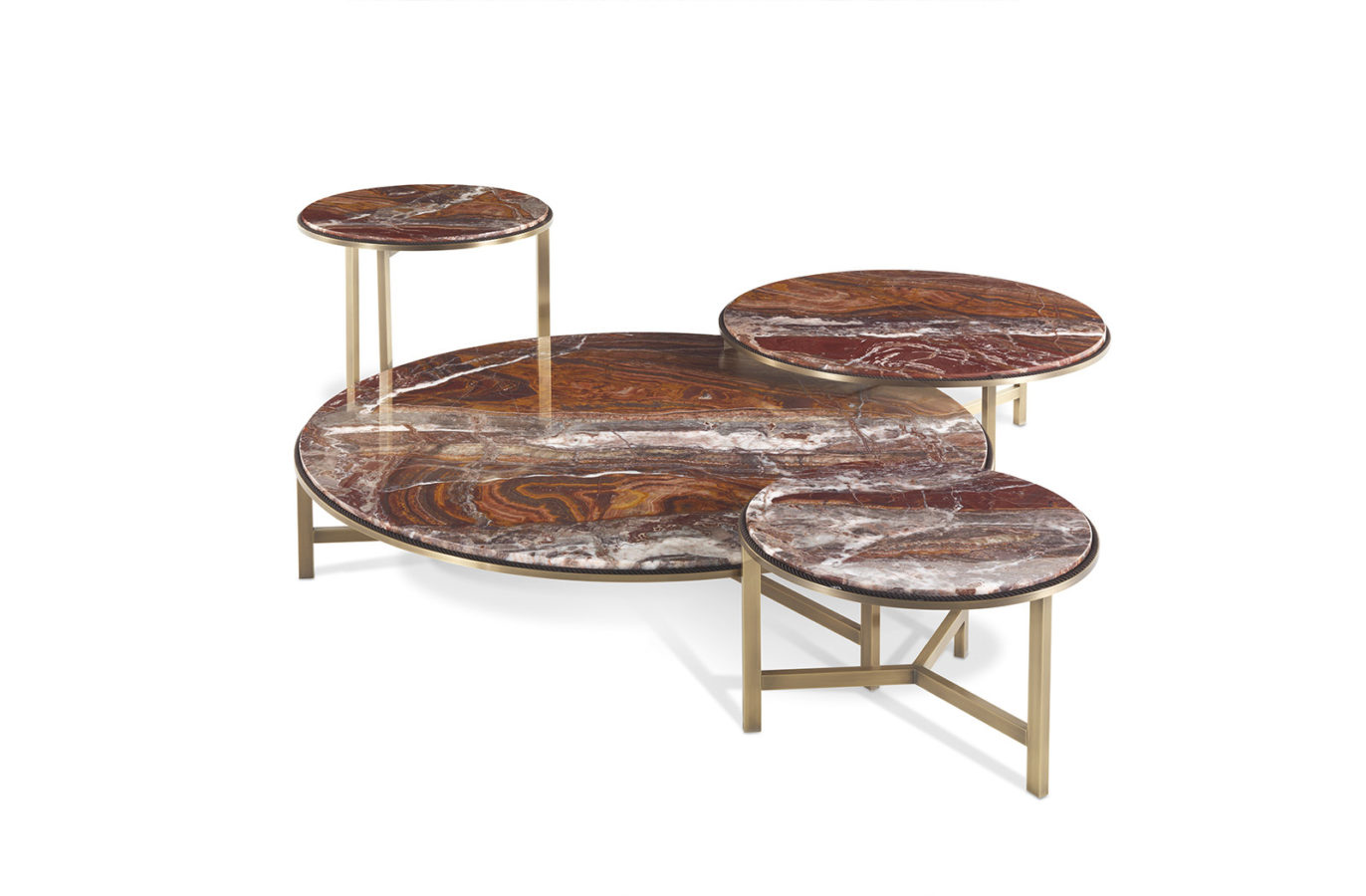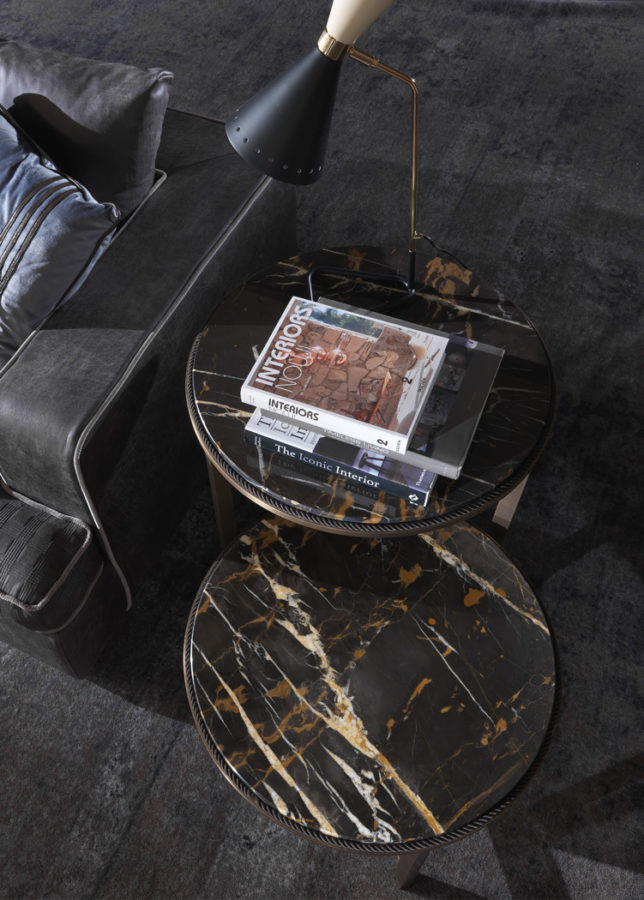 优雅的黑色和金色大理石台面是雅诗阁咖啡桌的主要特色,配有古铜色黄铜支腿。它有不同的尺寸,可以用作单个元素或用于创建不寻常的组合。金属结构边桌。古铜色饰面。绳索装饰。顶部是黑色和金色大理石和阿拉伯红玛瑙。