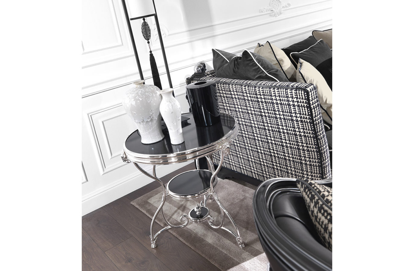 金属结构边桌。镀铬精加工。顶部和下部托盘采用多层杨木,采用黑漆表面处理。