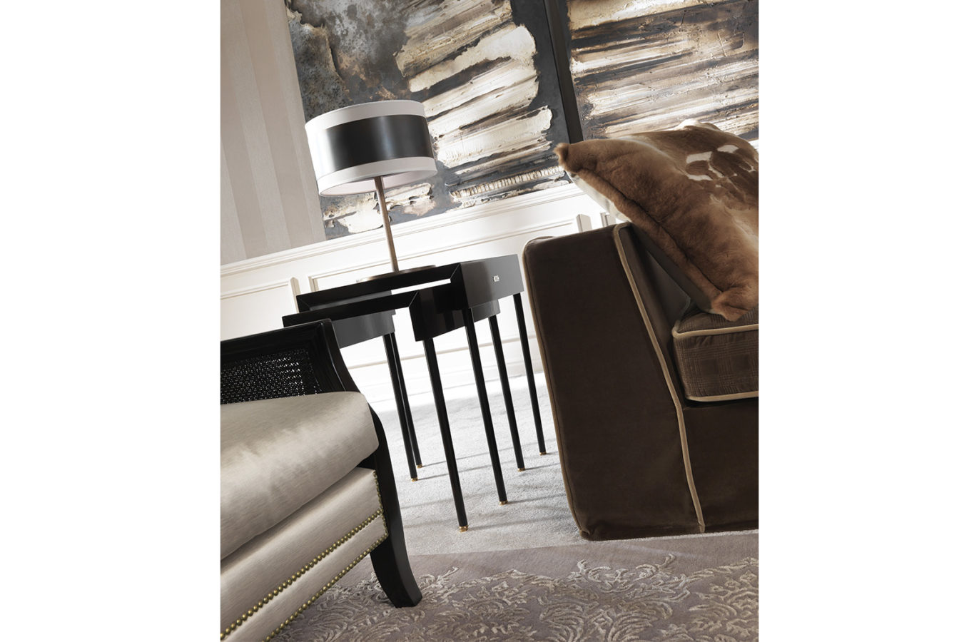 一对可堆叠的山毛榉木边桌。黑色漆面。