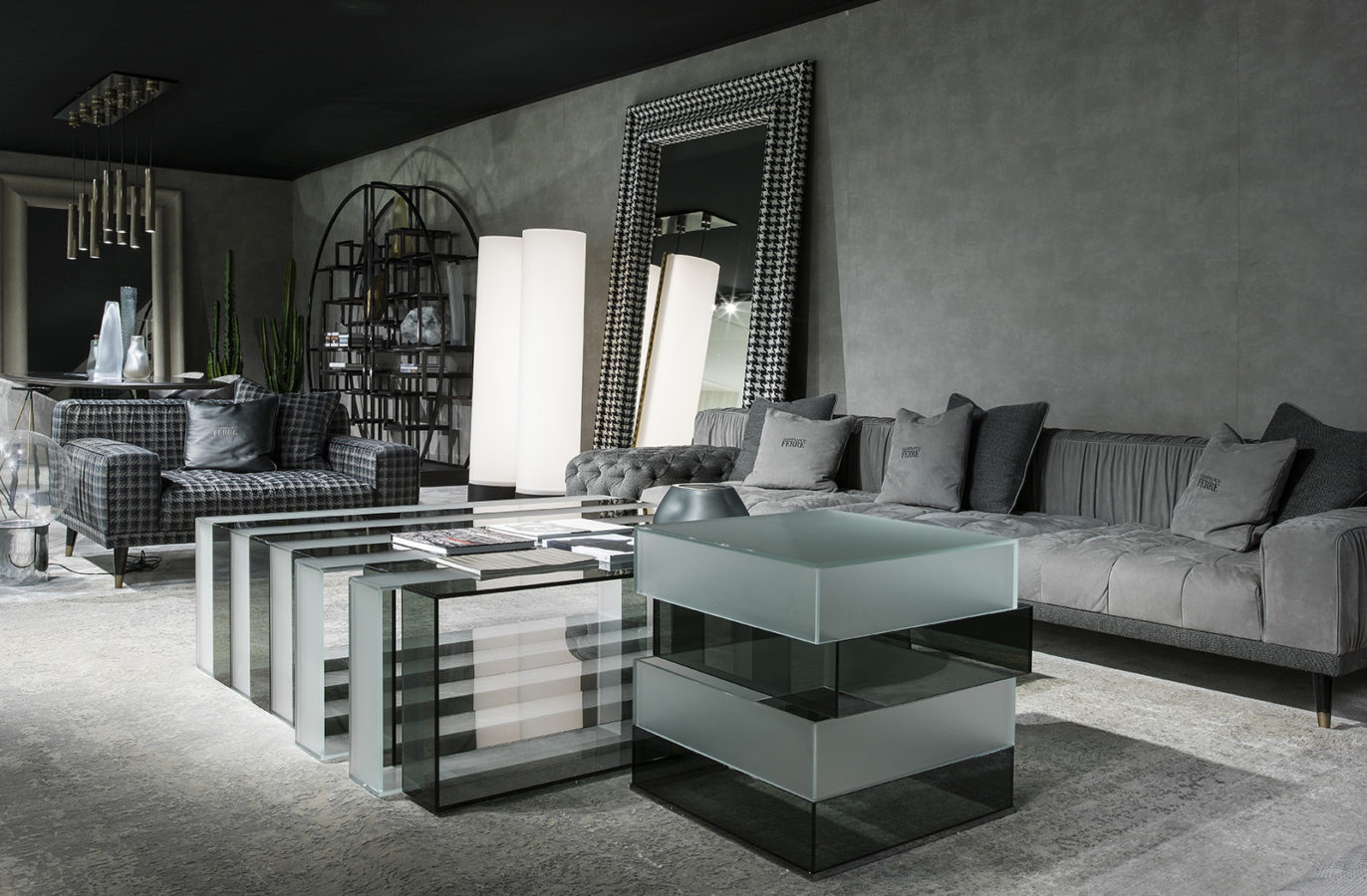 纯粹的体积和基本线条:这些是Jenga控制台的主要功能。具有精致设计的构图,表现为连续的浅色和深色玻璃矩形,以45°组装并在不显示移植物或接头的情况下连接在一起。整个结构由玻璃制成,整个作品以独特的轻盈和精致的块状呈现给人以。在一场令人惊讶的颜色和几何游戏中,明暗玻璃的组合今年在新的色彩调色板中被重新诠释,结合了缎面超透明和烟熏玻璃。中央桌子由青铜色和透明玻璃中的交替平行六面体制成,不规则地排列。这些元件通过使用UV胶水以45°无接头的方式组装。圆柱形黄铜支脚。